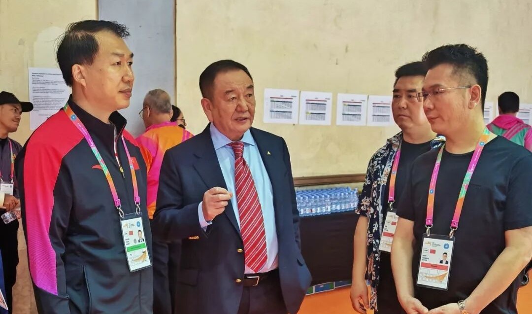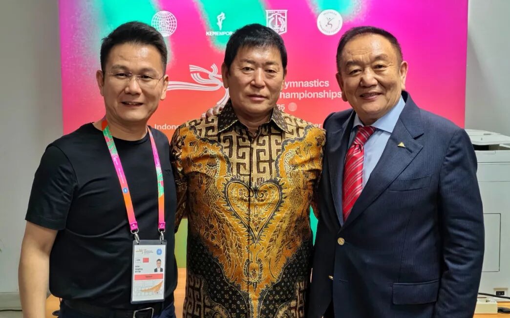 国家体育总局体操运动管理中心主任常成(左一)与泰山体育集团董事局主席卞志良、董事长卞青峰在比赛场馆现场交流