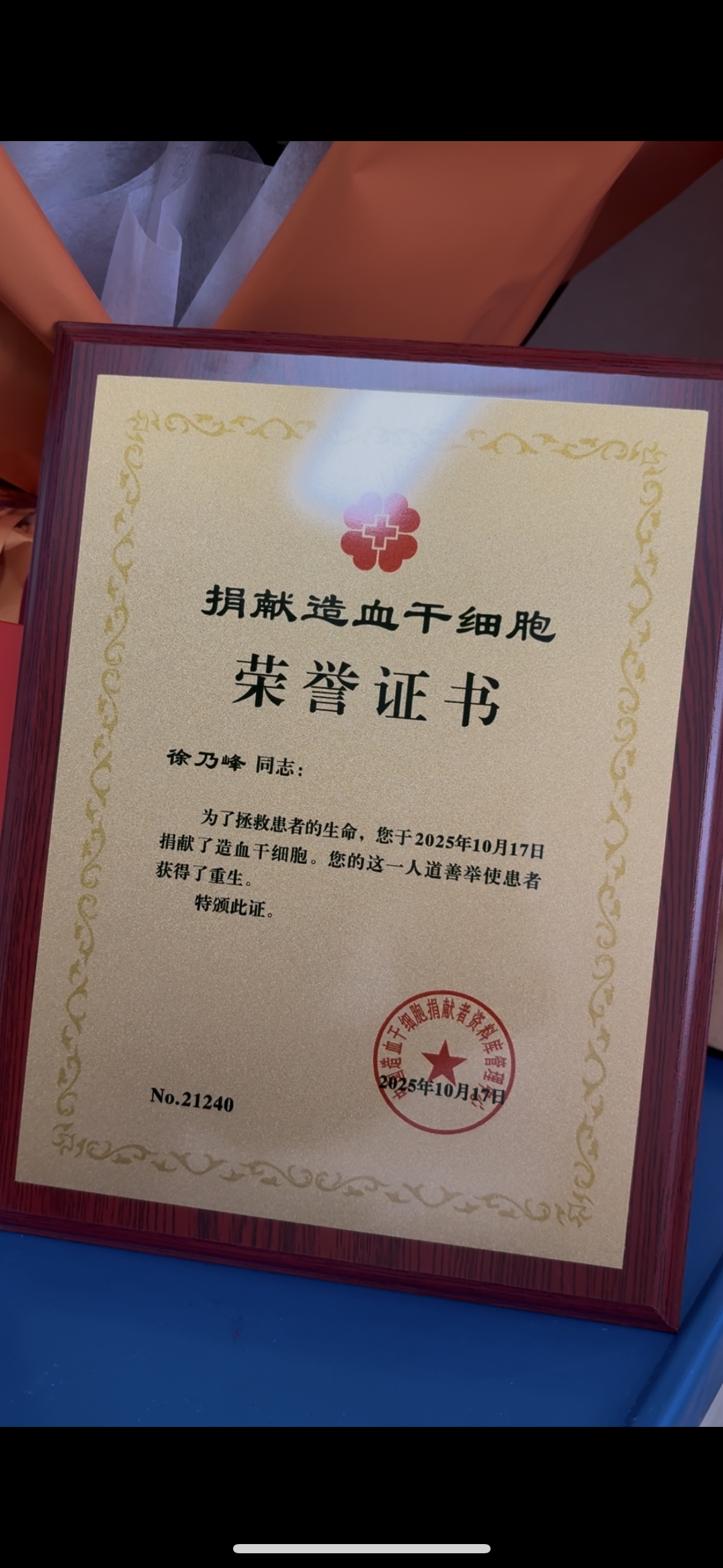 从第一次献血的懵懂,到成为中华骨髓库第21240例、山东省第1806例、德州市第99例、齐河县第7例造血干细胞捐献者,徐乃峰用行动证明:平凡人也能书写非凡的大爱。而这份爱,就像他捐献的 “生命种子”,会在更多人心里生根发芽。