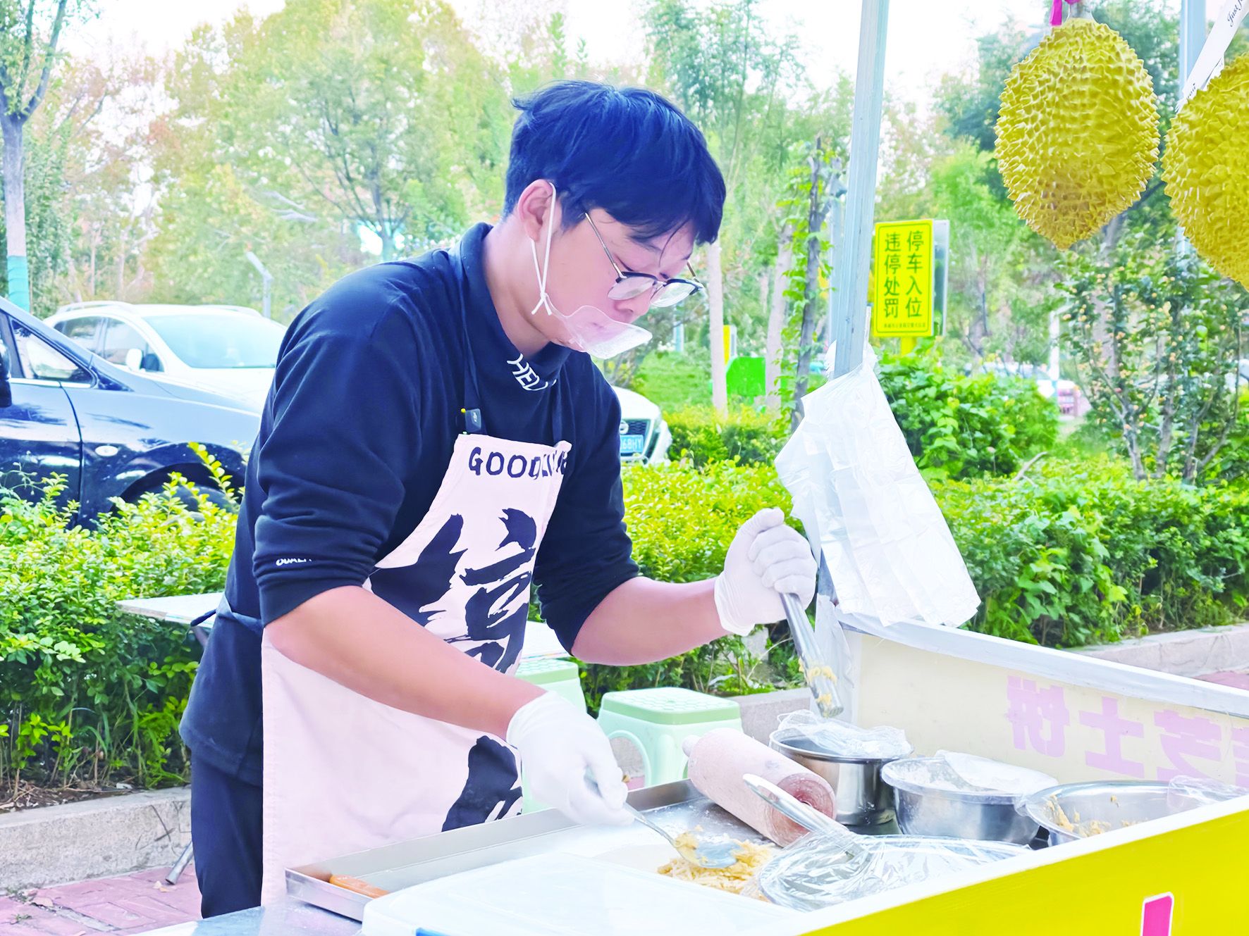我卖榴莲芝士饼很长时间了,以前总在路边“打游击”——每天推着小车东奔西跑,既要担心被检查,又得跟城管“躲猫猫”,挣点辛苦钱心里总悬着。自从禹城规划了便民疏导点,我终于有了固定摊位,再也不用到处找地方。这里统一划位、规范管理,位置好、人流量足,周边居民和上班族都爱来觅食。慢慢积累了不少回头客,有人甚至特意绕路过来,就为一口刚出炉的芝士饼——这份认可比啥都珍贵。