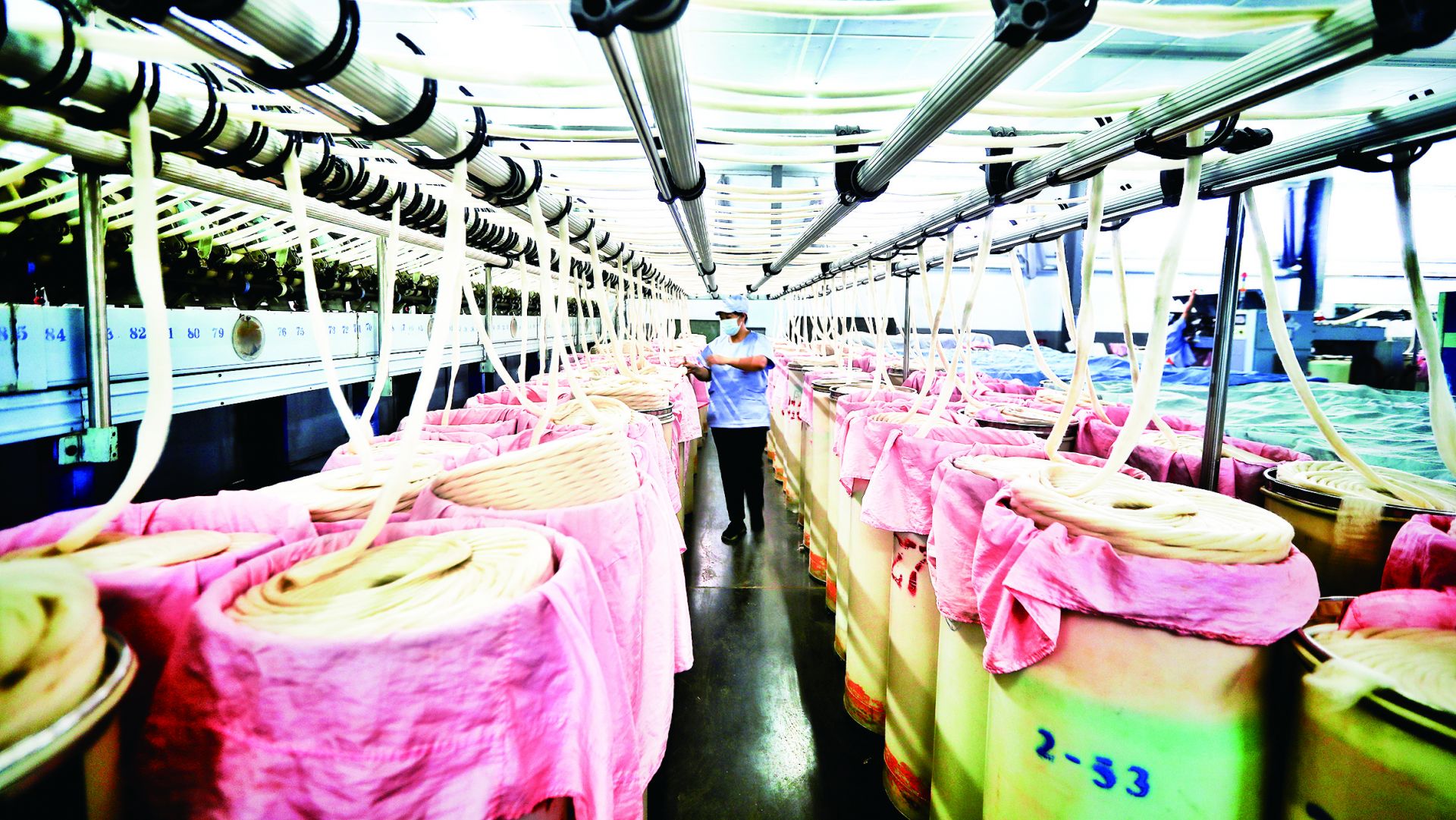 德信羊绒车间内,车间主任张国庆手持150支超细纱线介绍:“这是用有机原棉经十余道工序织就的,强力高、光泽足,是国内外高端服装企业的‘抢手货’。”