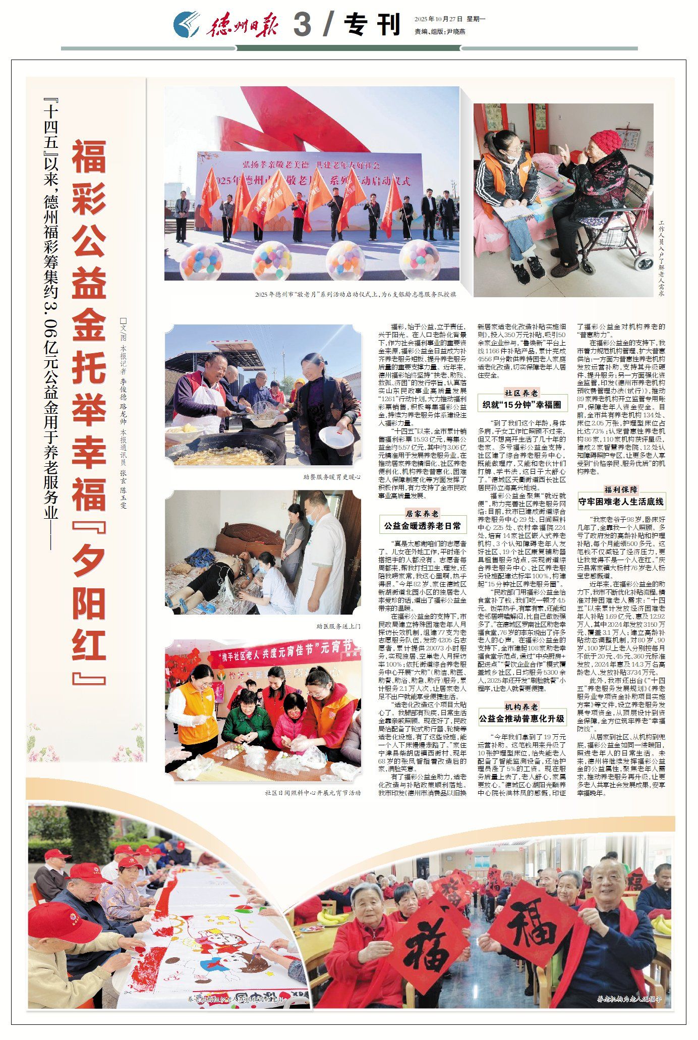 从居家到社区、从机构到兜底,福彩公益金如同一缕暖阳,照进老年人的日常生活。未来,德州将继续发挥福彩公益金的公益属性,聚焦老年人需求,推动养老服务再升级,让更多老人共享社会发展成果,安享幸福晚年。