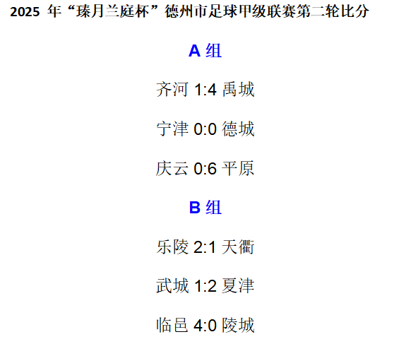在25日率先进行的A组三场比赛中,禹城队和平原队分别在客场取得胜利,宁津队和德城队握手言和。其中平原队在主教练杨程(前山东鲁能泰山队主力门将)的带领下,一扫首轮失利的阴霾,收获一场大胜。