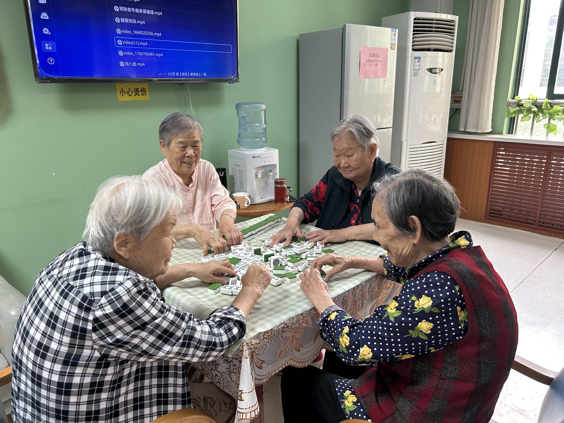 午休过后,安头乡康养服务中心也热闹起来。下棋、打牌、敲大鼓,老人们各得其乐。刘静架起手机,带领几位老人兴致勃勃地拍摄秧歌视频。中心内,各类健身器材与文娱设备逐步完善,各功能区域划分清晰、布局合理。“我们每逢节日,都会组织活动,像今年中秋的文艺演出,就是由老人与护理员自编自导自演。此外,我们还会不定期邀请志愿者前来,开展太极拳培训、棋牌竞技、电影放映、书法绘画交流等休闲娱乐活动,让老人们的晚年生活充实又有滋味。”刘静介绍。