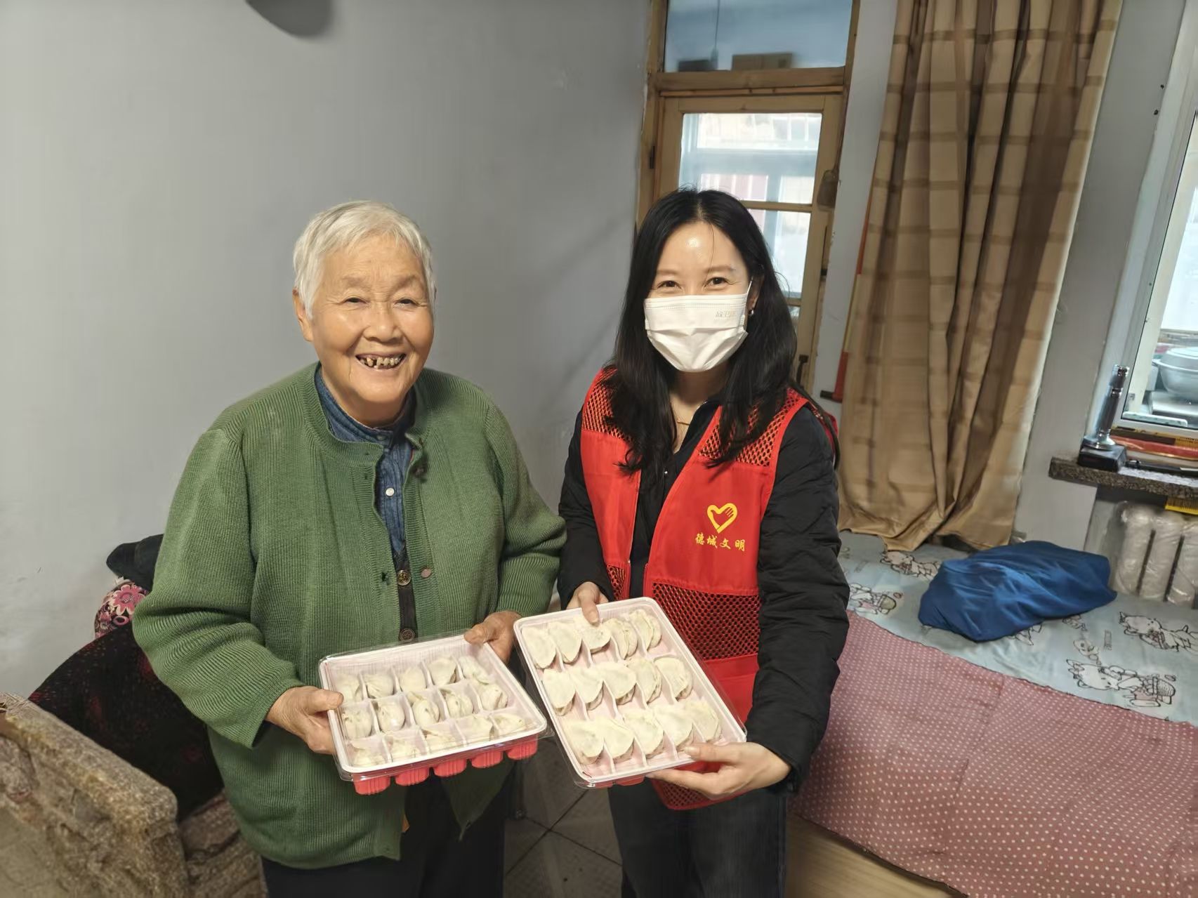 活动当天一早,社区活动室里便已是一片热火朝天的景象。社区的社工和志愿者早早来到现场,大家分工明确,配合默契。和面、擀皮、调馅、包捏……动作娴熟,一气呵成。欢声笑语中,一个个形态各异、饱满诱人的饺子很快就摆满了托盘。每一个饺子里,包进去的不仅是新鲜的食材,更是大家对老人们满满的祝福与关爱。社工和志愿者小心地将饺子分装进保温餐盒,分组前往辖区高龄、独居老人的家中。工作人员不仅送上了热乎乎的饺子,更送上了节日的诚挚问候。他们与老人促膝长谈,细心询问他们的身体状况和生活近况,叮嘱他们天气转凉,要注意添衣保暖。