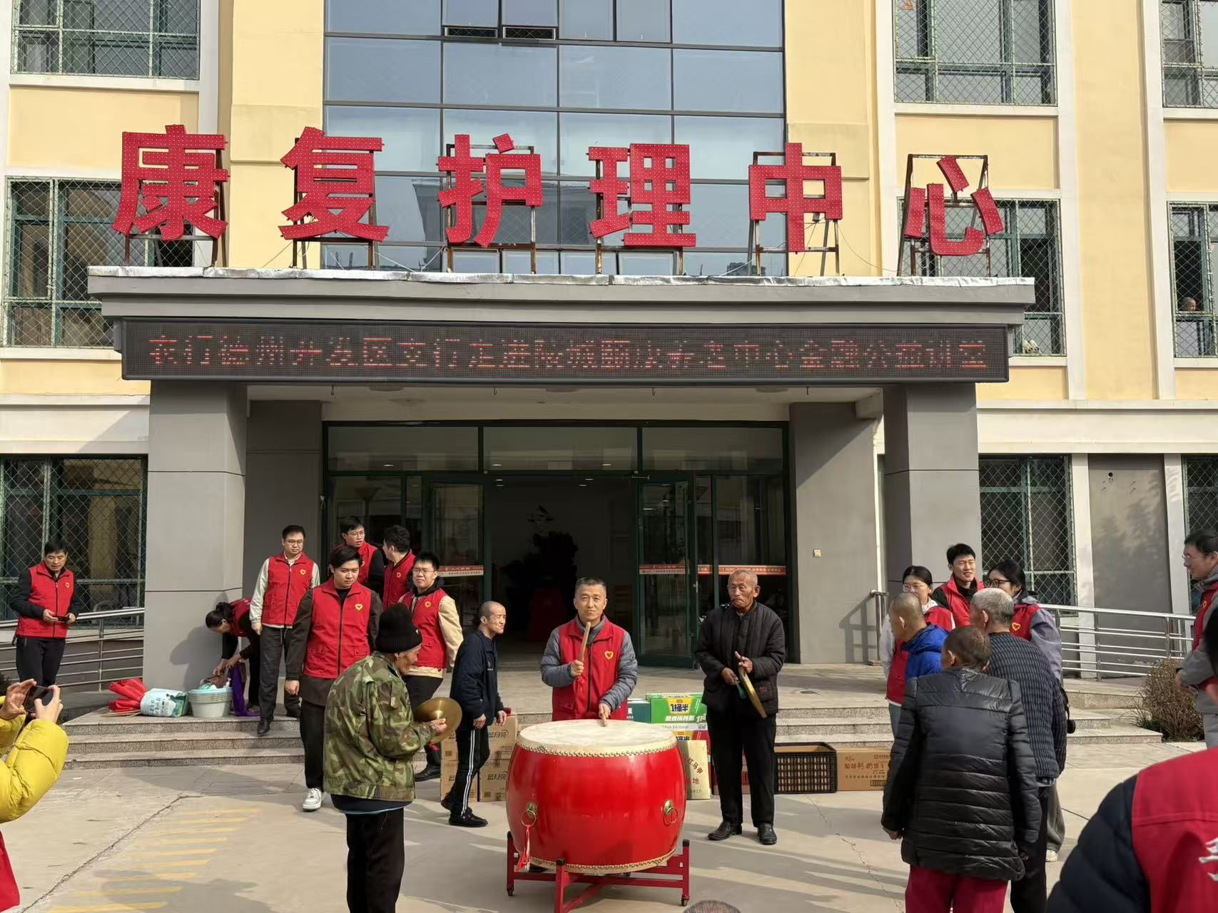 门前广场上,志愿者们与老人们热情互动,即兴组织起了锣鼓秧歌活动,志愿者们接过锣鼓槌,和老人们一起踏着欢快鼓点,扭起传统秧歌。铿锵的锣鼓声与朗朗笑声交织在一起,大家都参与进来。