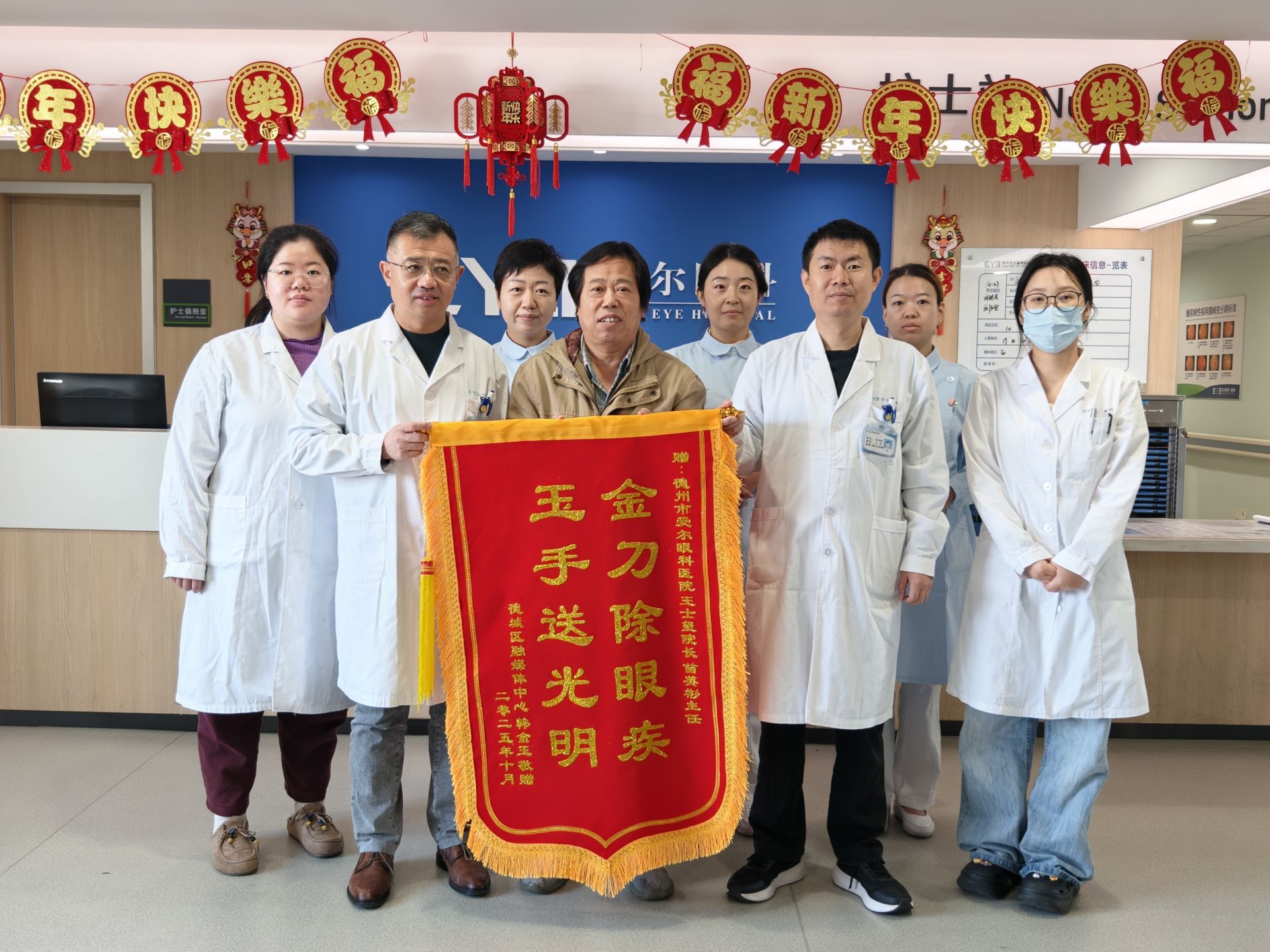 “终于能看见了,太感谢了!”10月29日,德州爱尔眼科医院复查室内,糖尿病视网膜病变患者韩金玉握着院长张士玺的手激动不已。他不仅向医护人员表达感谢,还送上一面写有“金刀除眼疾 玉手送光明”的锦旗。