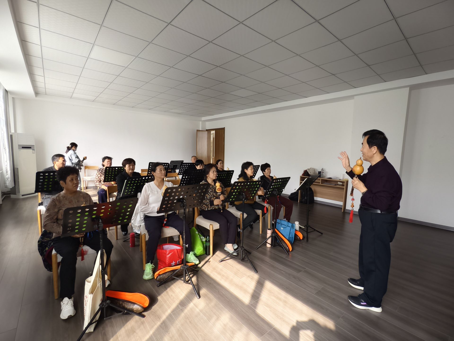 每天上午,悠扬婉转的古琴声从声乐班传出,古琴教师田金发轻拨琴弦,学员们跟着齐奏,整个走廊都回荡着优美动人的旋律。