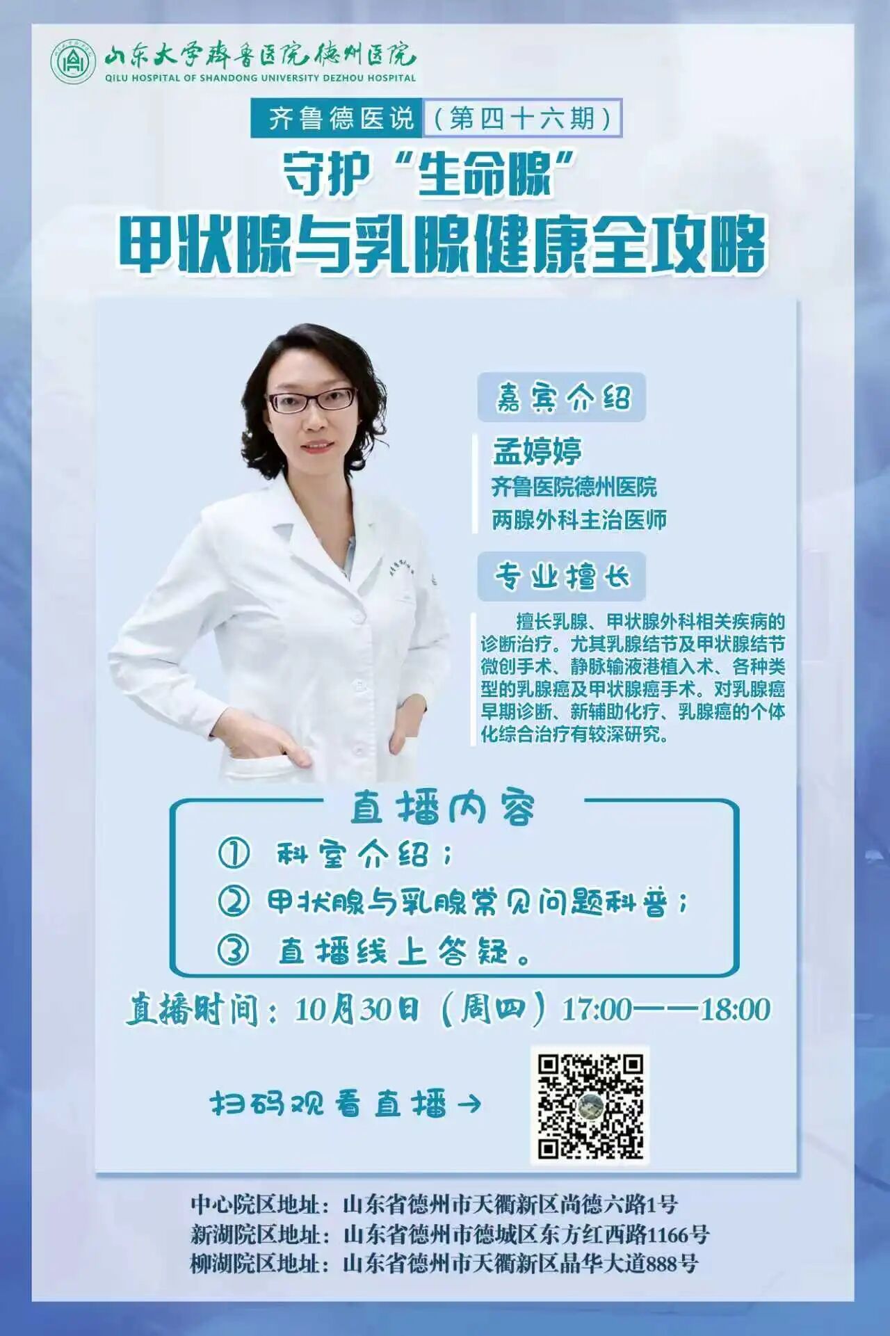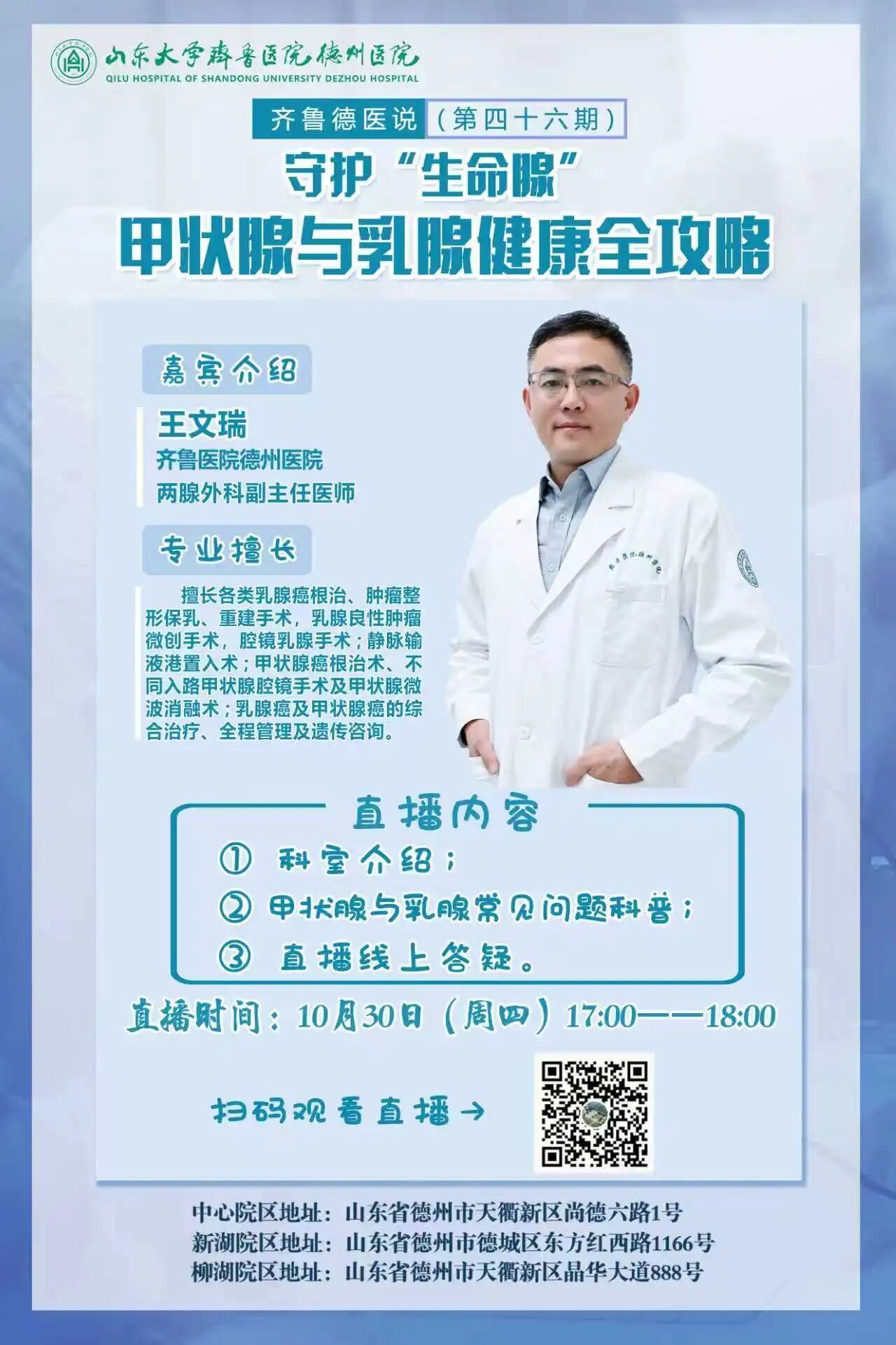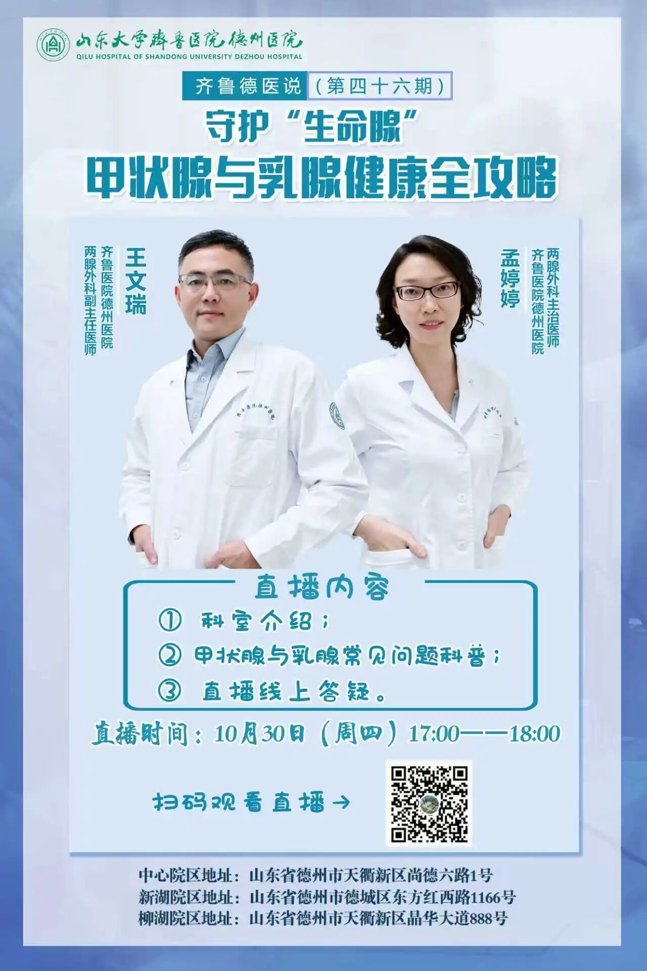 10月30日(本周四)17:00,齐鲁医院德州医院将开展《齐鲁德医说》(第四十六期)大型直播活动,本次邀请到齐鲁医院德州医院两腺外科副主任医师王文瑞,两腺外科主治医生孟婷婷,针对甲状腺与乳腺等相关问题进行线上答疑。
