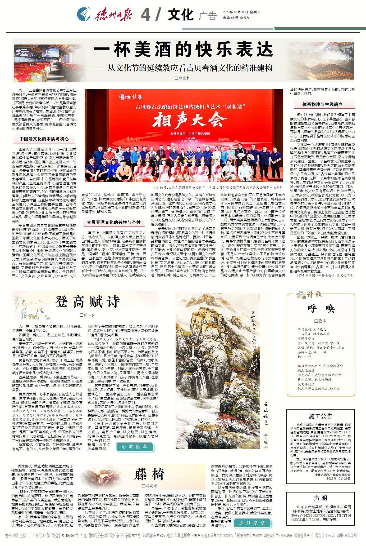 事实上,中国酒文化有广义与狭义之分。笔者认为,广义的酒文化本质上就是突出“悦己达人”的精神属性,这是所有白酒都应具备的共性文化。对此,鲁迅文学奖获得者、著名诗人、散文家、书法家雷平阳先生更是一语道明:“畅神”,可谓凝练、干脆,直击要害。但很显然,在推动酒文化建设助力营销的过程中,仅有共性文化是不够的,在突出酒文化核心价值的同时,每一个品牌酒企还应有个性化的表达,诸如来自地域的、历史的、风味的等各具特色的文化融入,这就是狭义的酒文化或者说是品牌文化。坐落在京杭大运河之滨,潜心经营七十余年的古贝春酒业深谙此道。业内周知,这家以运河流域文化为品牌标识的老牌酒企,早在20世纪90年代便叫响了一句传唱大江南北的广告语“千年大运河,万家古贝春”,这便是古贝春酒文化中的品牌文化,或者说是古贝春文化的个性表达部分。
