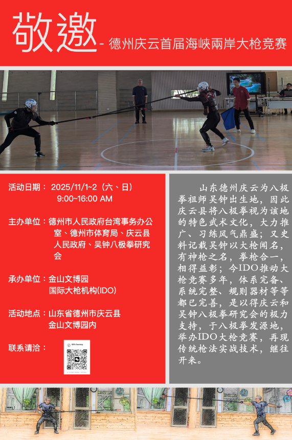 为进一步深化两岸同胞交流交往,挖掘并弘扬中华传统文化精髓,德州市依托深厚的文化底蕴与资源优势,将举办2025海峡两岸八极拳技艺交流大会暨首届大枪对抗赛与海峡两岸(德州)大禹文化交流活动,届时邀您共赴文化之约、共享运动激情。