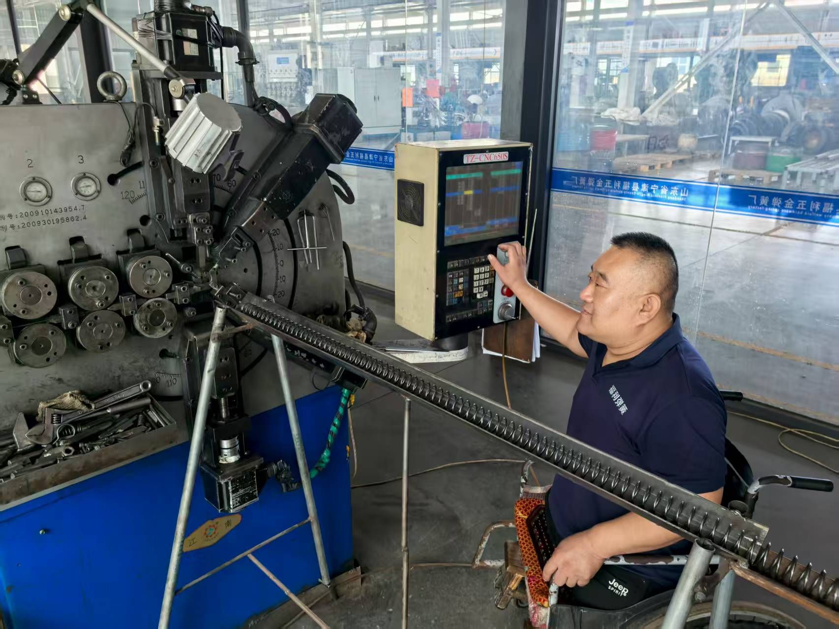 为了让残疾人更好地适应工作,企业对各个生产岗位进行了细致分析和评估,从工作强度、操作难度、环境要求等多方面入手,梳理出适合不同残疾类型和程度的岗位。46岁的刘振恒因为事故失去双腿,只能依靠轮椅行动。工厂为他安排了弹簧数控机器调试这一岗位,通过认真学习实践,如今他一个人操控轮椅照看4台机器,每个月的平均工资达到5000元。