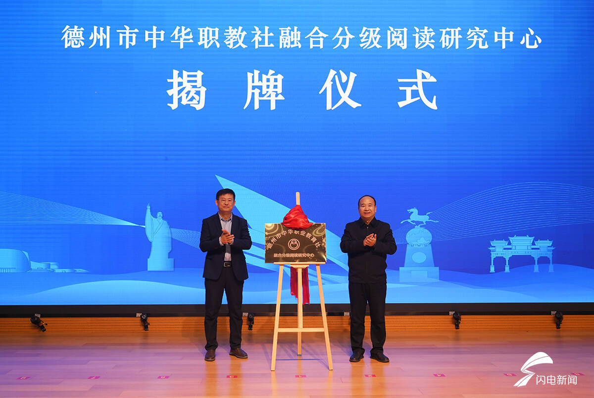 市委宣传部副部长、市文联党组书记李文豪与德州职业技术学院党委委员、组织部部长、统战部部长李强为德州市中华职教社融合分级阅读研究中心揭牌