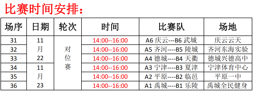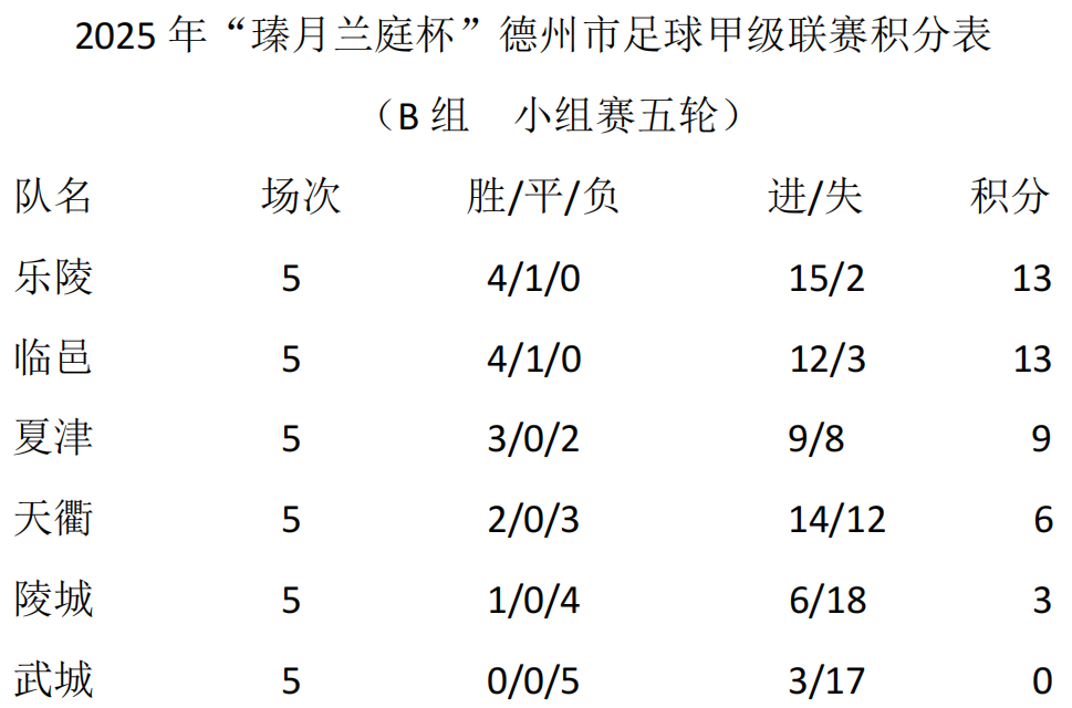 B组竞争同样激烈,乐陵在本轮因武城弃赛而3:0获胜,最终凭借净胜球优势力压临邑,夺得小组第一。临邑在本轮比赛中以3:2险胜天衢,但仍以微弱劣势屈居小组第二。另一场比赛中,夏津以3:1战胜陵城。