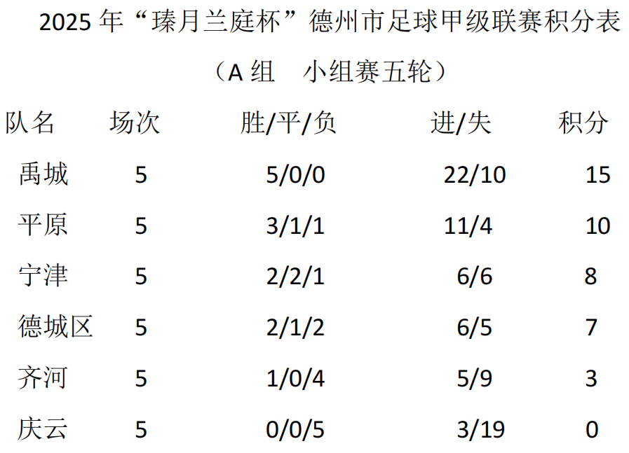 A组方面,禹城队延续了此前的强势表现,在本轮以8:3大胜庆云,以五战全胜的完美战绩结束小组赛征程。该队在五场比赛中疯狂攻入22球,展现出强大的进攻火力,被视为本赛季冠军的有力争夺者。同组另一场比赛中,宁津以3:2力克齐河,而德城则0:1不敌平原。