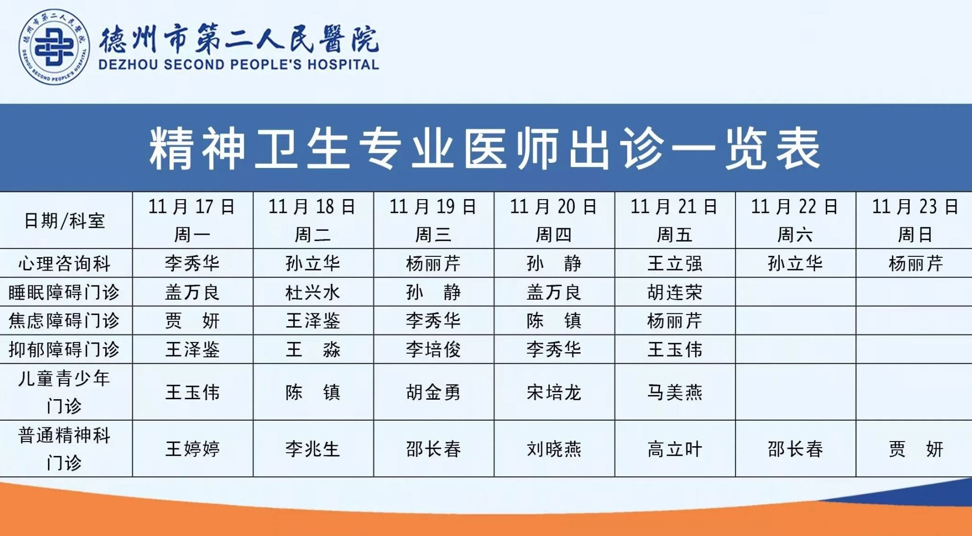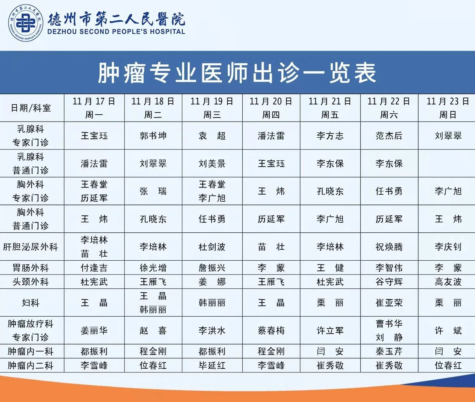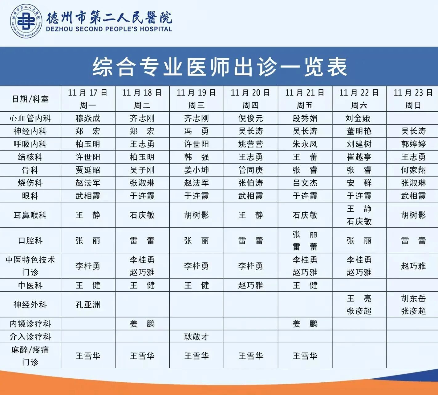 为方便广大市民朋友们就医,德州市第二人民医院11月17日至11月23日门诊医师出诊表如下。若有变化,以当天出诊安排为准(门诊上班时间为上午8:00至11:30,下午13:30至17:00)。