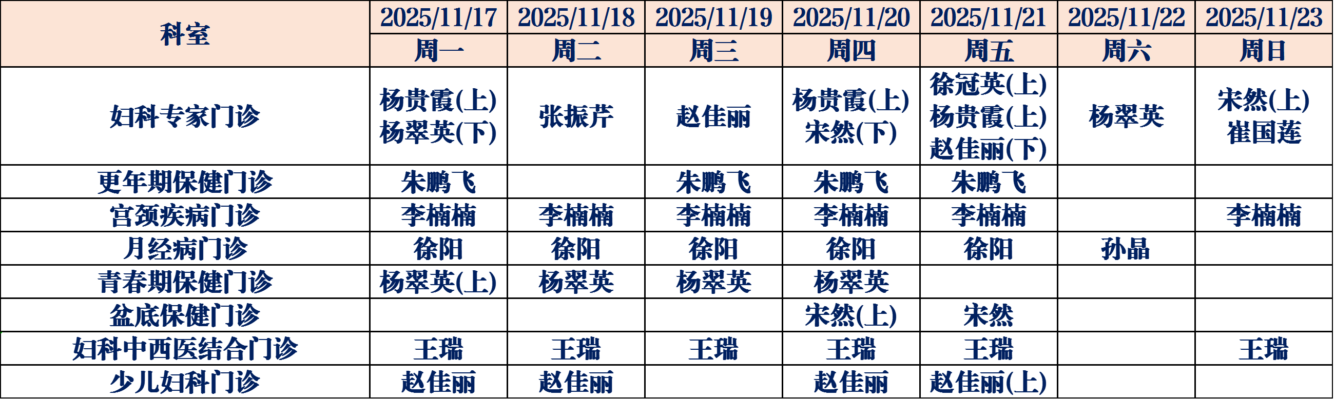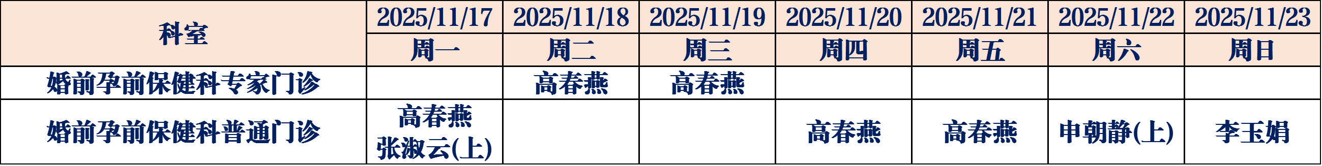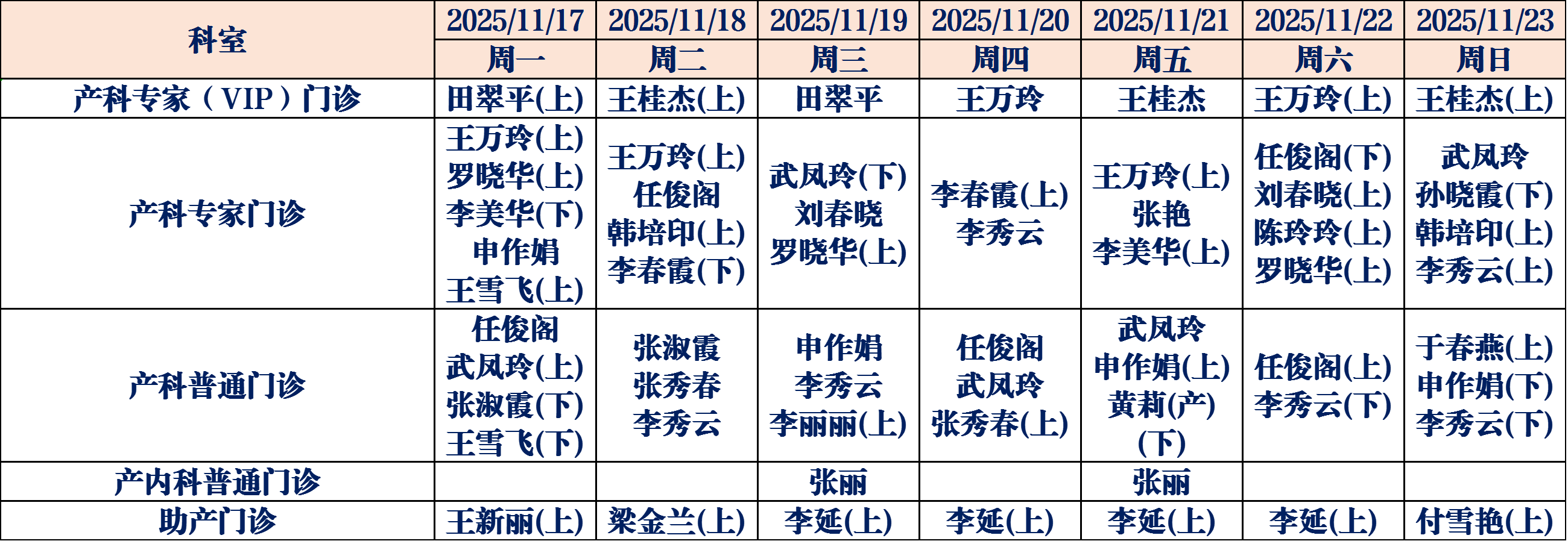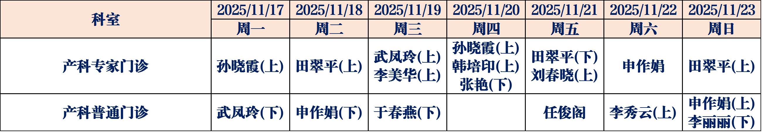为了更好地满足广大人民群众就医需求,德州市妇幼保健院11月17日至11月23日门诊医生坐诊表如下,请您根据需求选择合适的时间进行就医。