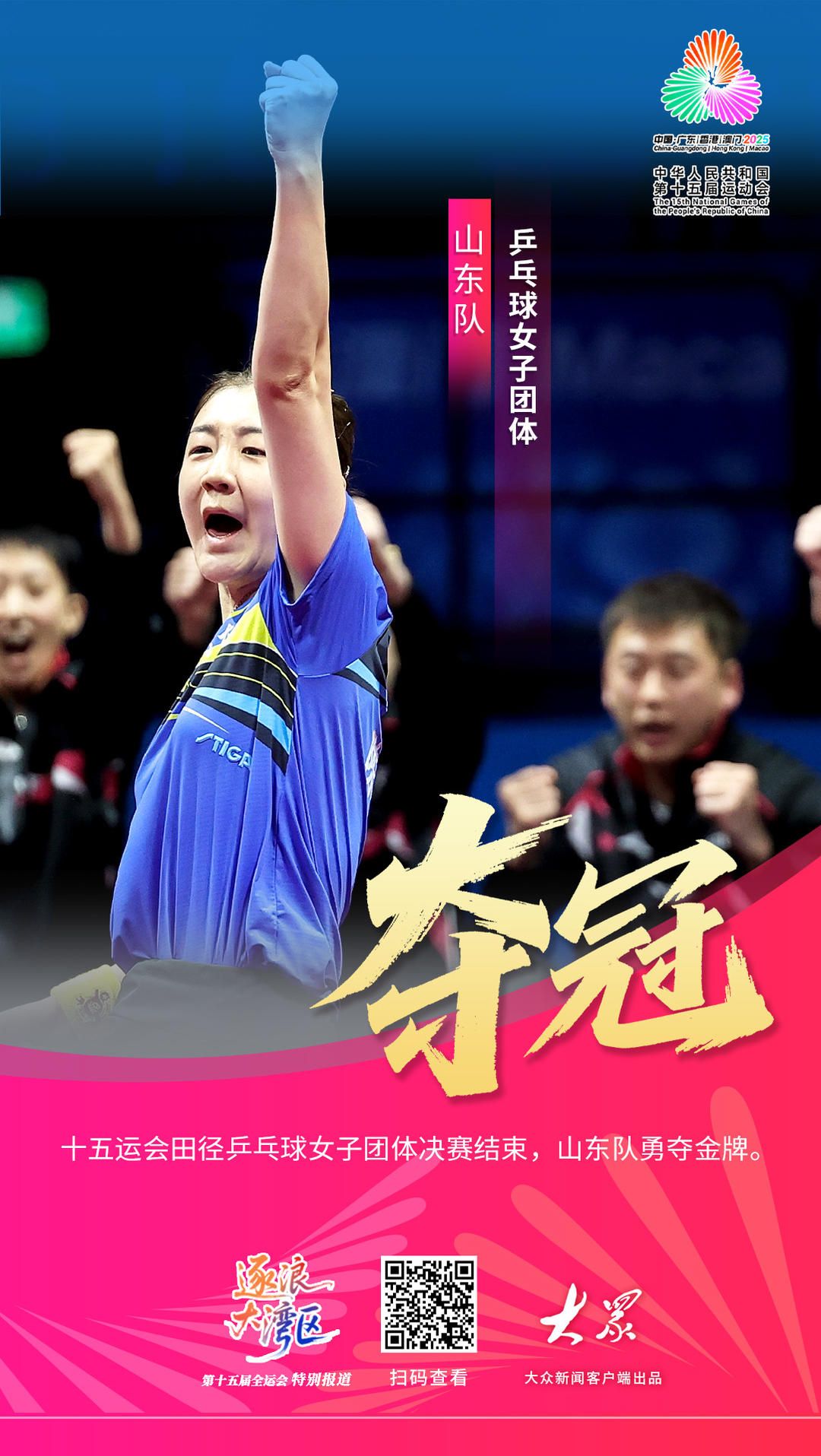 打满五场!山东队夺十五运乒乓球女子团体金牌 2025-11-19 21:36 大众新闻 0 11月19日晚,第十五届全运会乒乓球女子团体决赛迎来激烈角逐,经过5盘对决,山东队获得全运会乒乓球女子团体金牌。