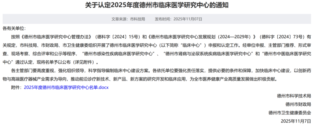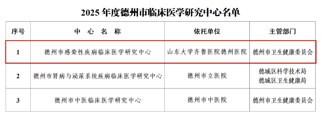 近日,德州市科学技术局、德州市财政局、德州市卫生健康委联合发布了《关于认定2025年度德州市临床医学研究中心的通知》。齐鲁医院德州医院获批“德州市感染性疾病临床医学研究中心”。