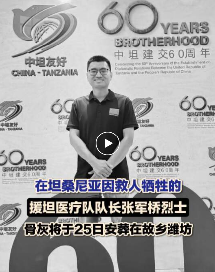 在坦桑尼亚因救人牺牲的援坦医疗队队长张军桥烈士骨灰将于25日安葬在故乡潍坊