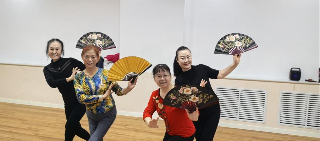 培训现场,舞蹈老师耐心指导,学员们热情高涨。在明亮整洁的多功能活动室内,伴随着悠扬的音乐,学员们手执彩扇,神情专注,步伐轻盈。她们或高举折扇,舒展手臂,或单腿直立,翩翩起舞,动作优美而充满活力。手中的扇子随着节奏开合翻转,黑色、深紫色的花卉扇面典雅大方,亮黄色的素面扇子鲜艳夺目,与学员们脸上洋溢的自信笑容交相辉映,构成了一幅生动和谐的画面。