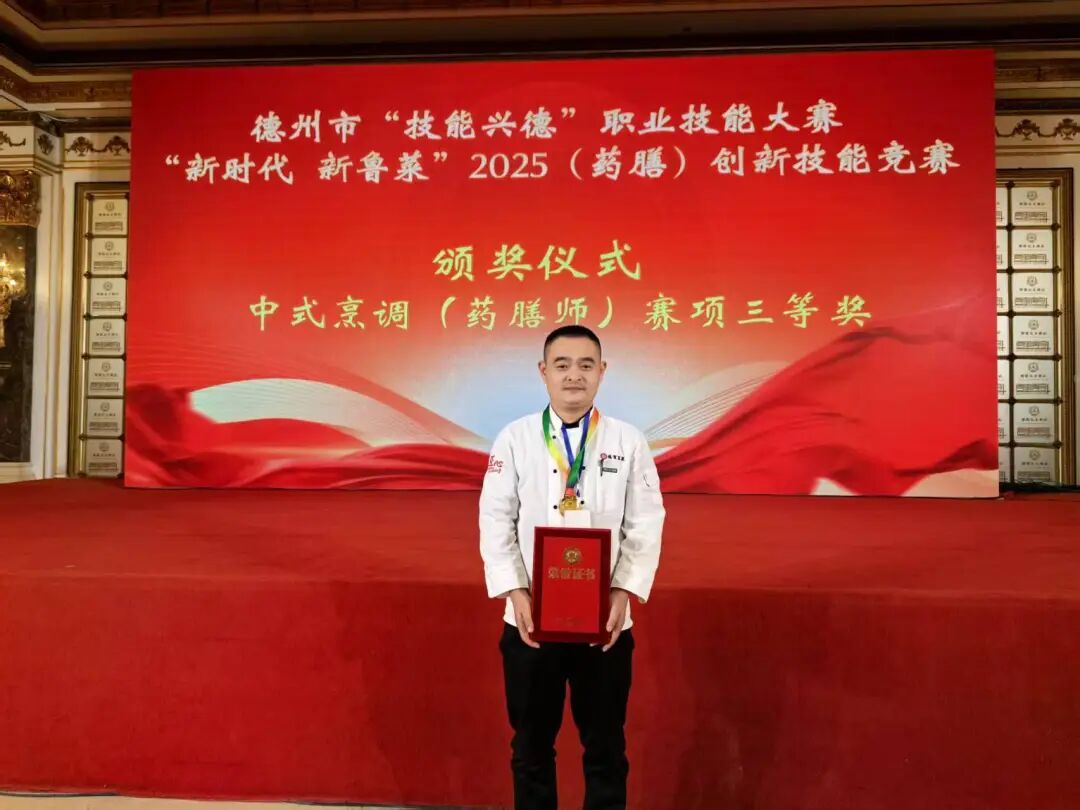 夏津德百温泉旅游小镇张书英荣获中式面点(药膳师)赛项二等奖,陈猛强荣获中式烹调(药膳师)赛项三等奖。