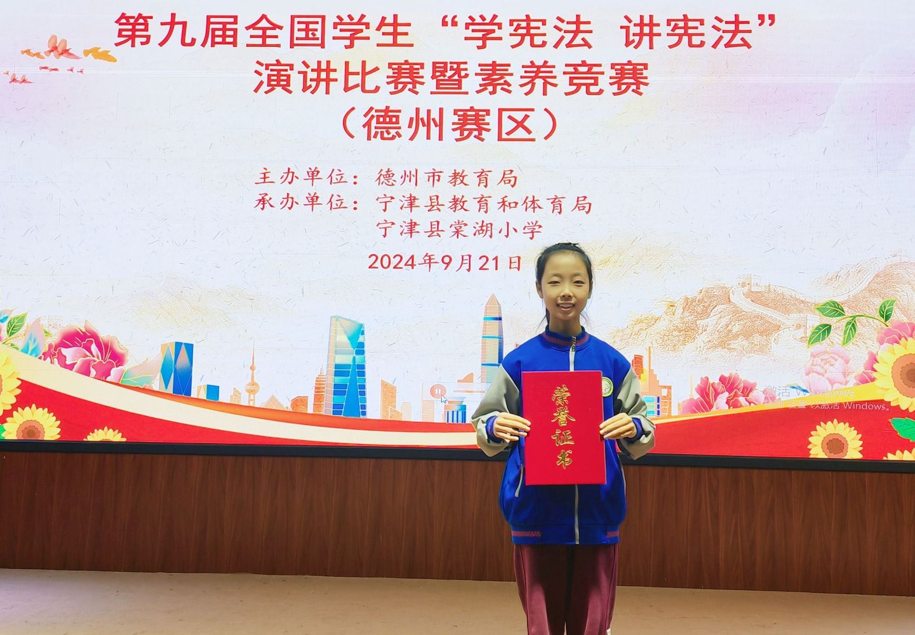 她深耕知识的海洋,在第九届全国宪法知识竞赛中斩获德州赛区二等奖,于德城区素养考试中勇夺一等奖,多次被评为三好学生、十佳少先队干部等称号。在德州市入队入团入党活动中,作为少先队员代表献词;在学校举行的开学典礼、运动会、六一演出、新队员入队等多项活动中,均有出色表现。同时她担任班长,是老师得力的帮手,也是同学信任的伙伴。在一次次沟通与协调中,练就了出色的组织能力与应变思维。