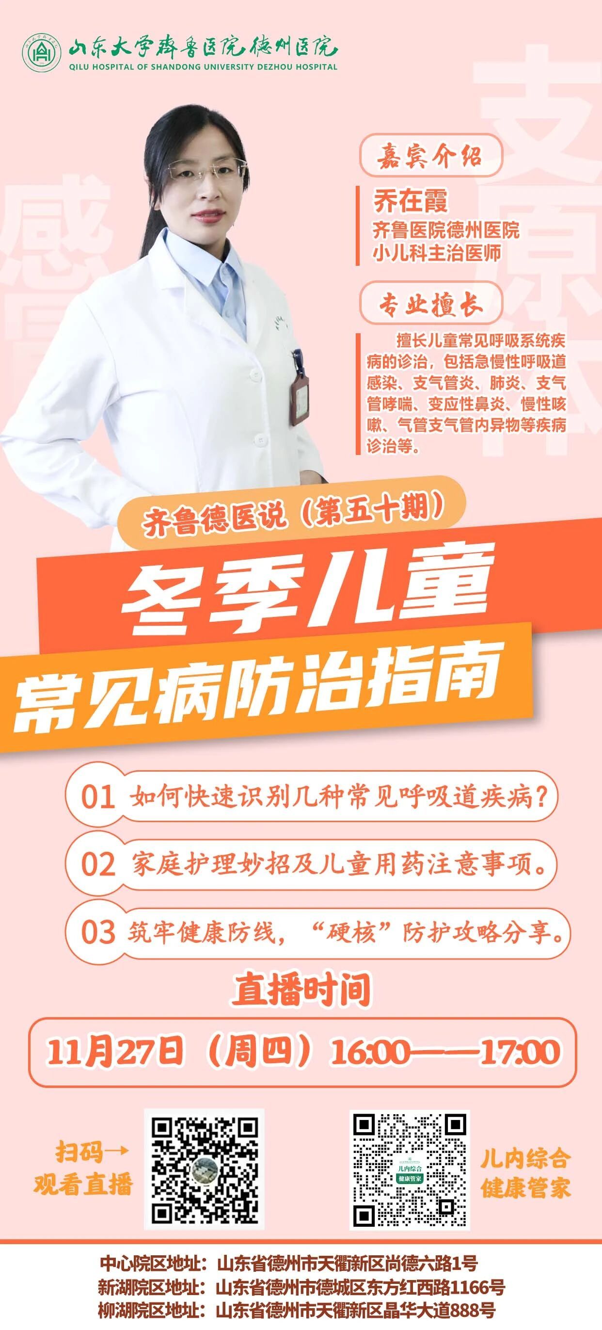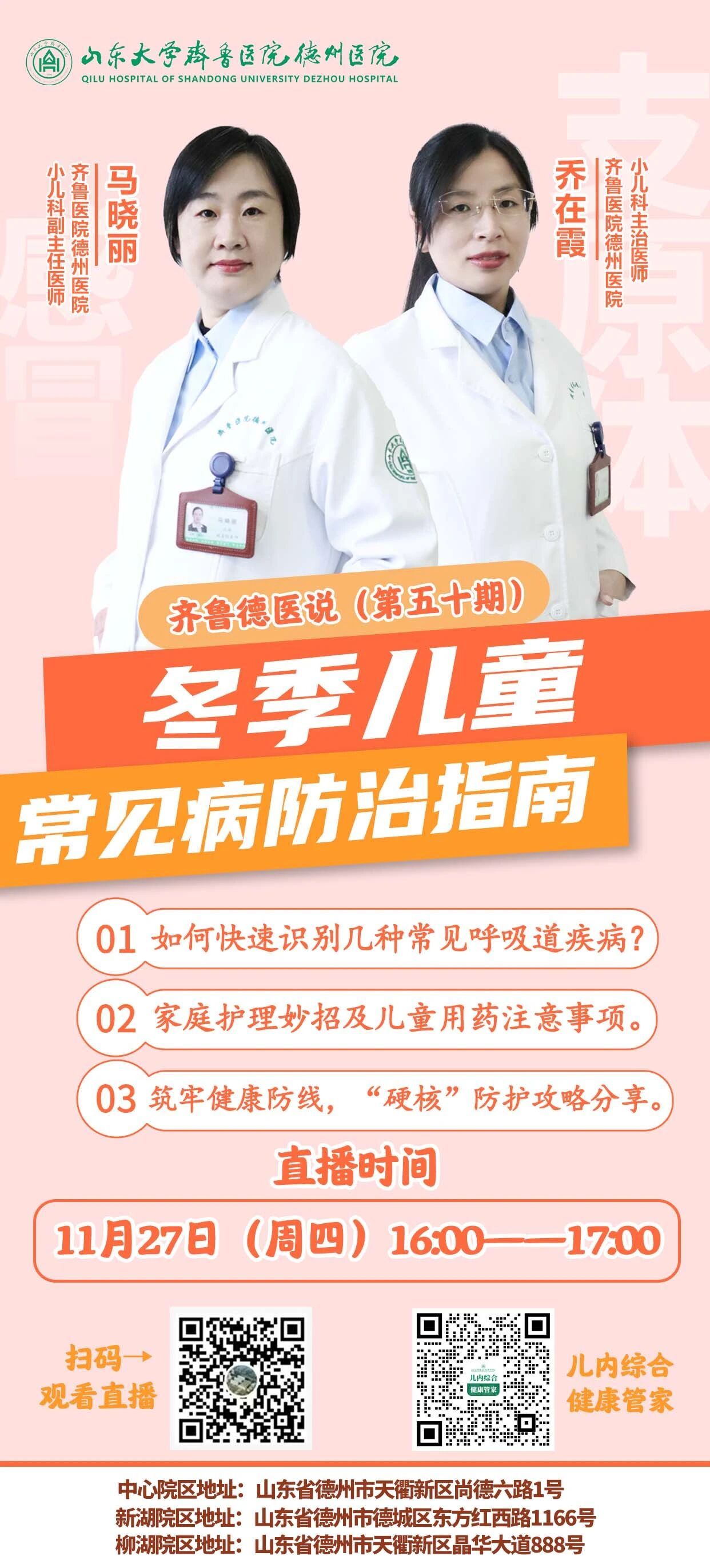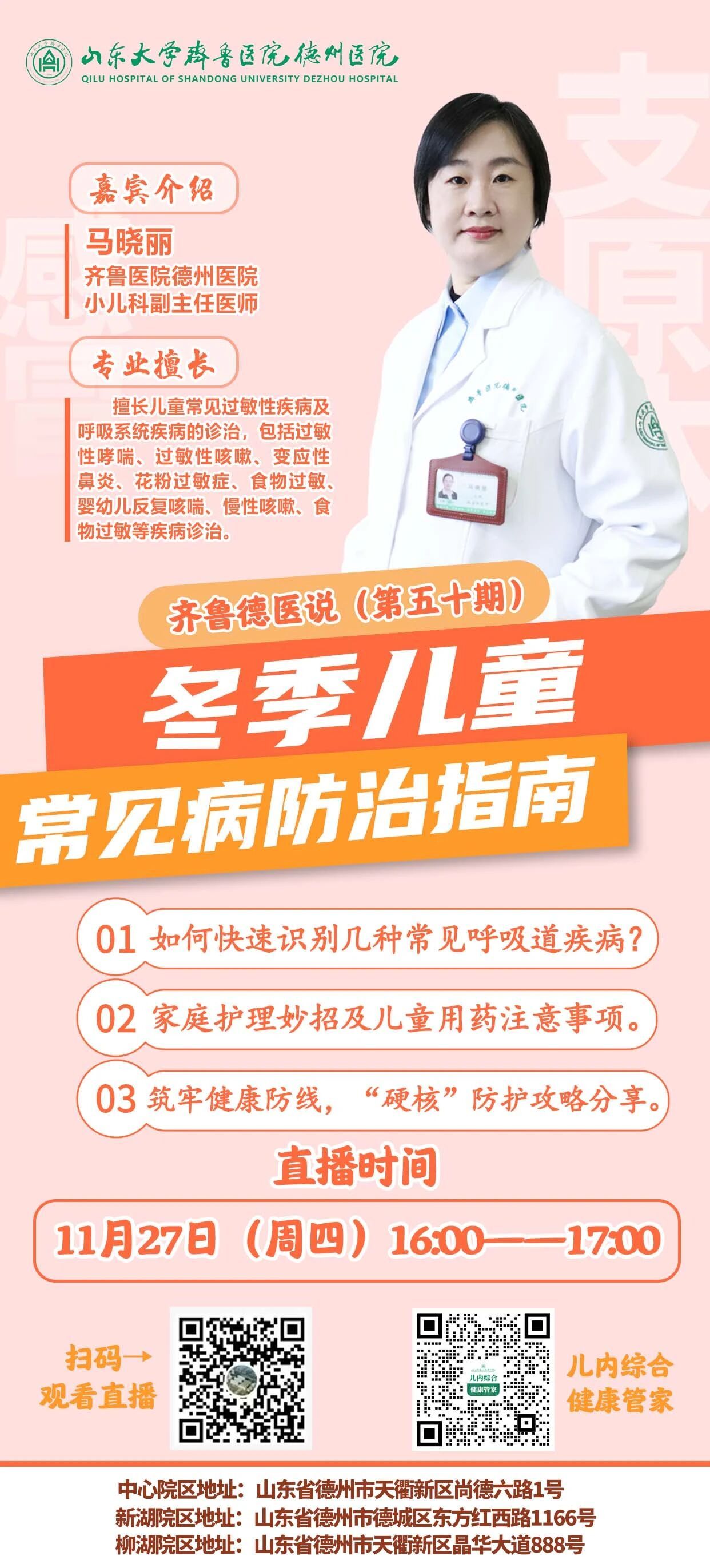 11月27日(本周四)16:00,齐鲁医院德州医院将开展《齐鲁德医说》(第五十期)直播活动,本次邀请到齐鲁医院德州医院小儿科副主任医师马晓丽、主治医师乔在霞,针对冬季儿童常见病、多发病的相关问题进行线上答疑。