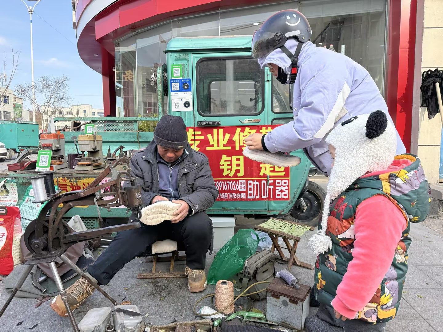 当天,还走访了在禹城市摆摊修鞋、配钥匙的张树强,靠着多年积累,他的摊位前生意不断,53岁的他一天工作10个小时,虽然穿着厚厚的棉裤,但佩戴假肢的右腿,还是感觉冰冷,但为了生活,他直言早已习惯。