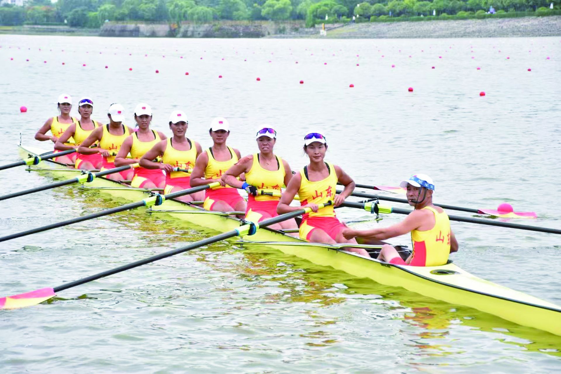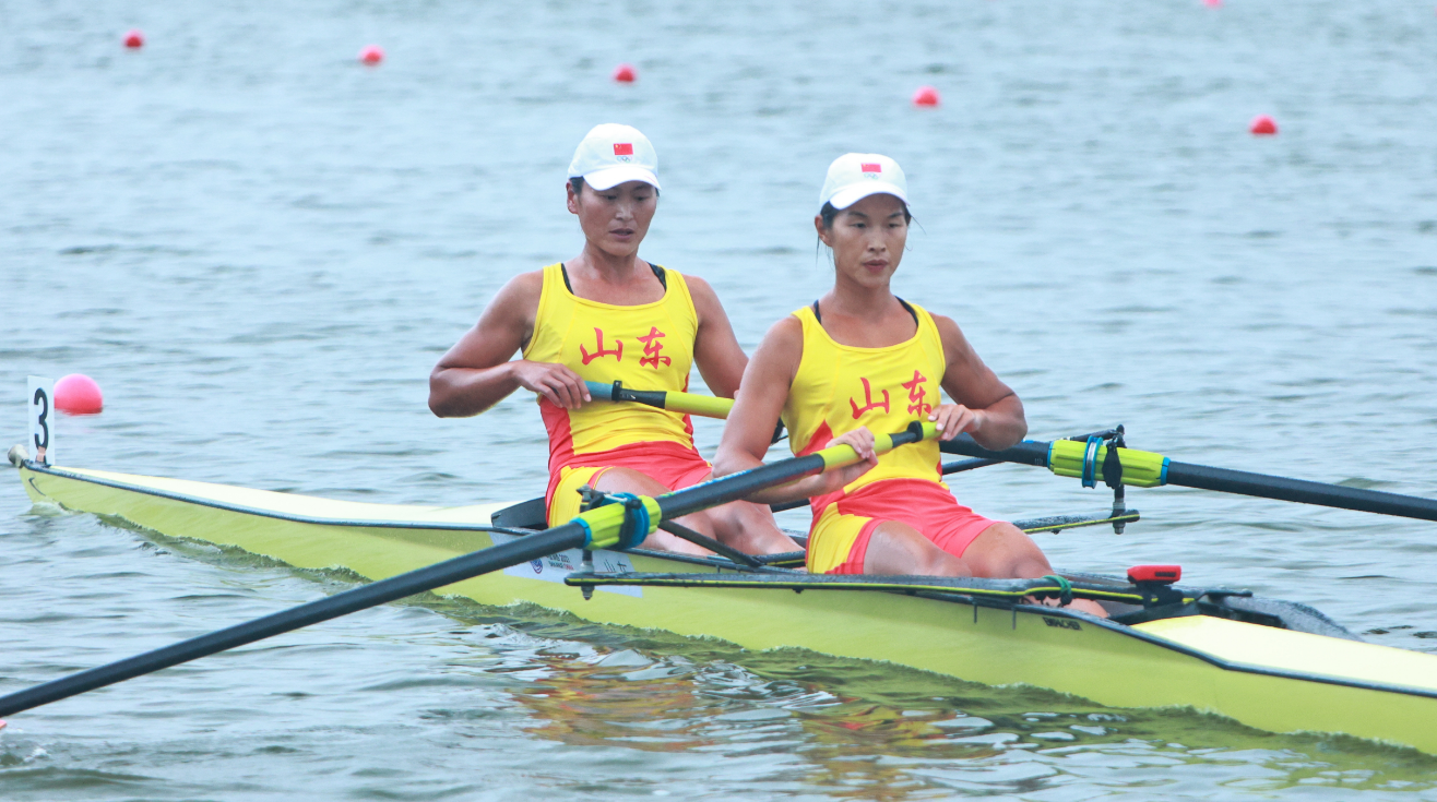 11月11日,南粤的水面之上,第十五届全动会赛艇女子八人单桨决赛的航道浪涌风急。山东队赛艇如一支出弦之箭,在最后400米突然发力,再度提桨加速!领桨手郭淋淋目光如炬,以沉稳的节奏引领着身后的七位队友,破浪前行,稳稳地将金牌收入囊中。