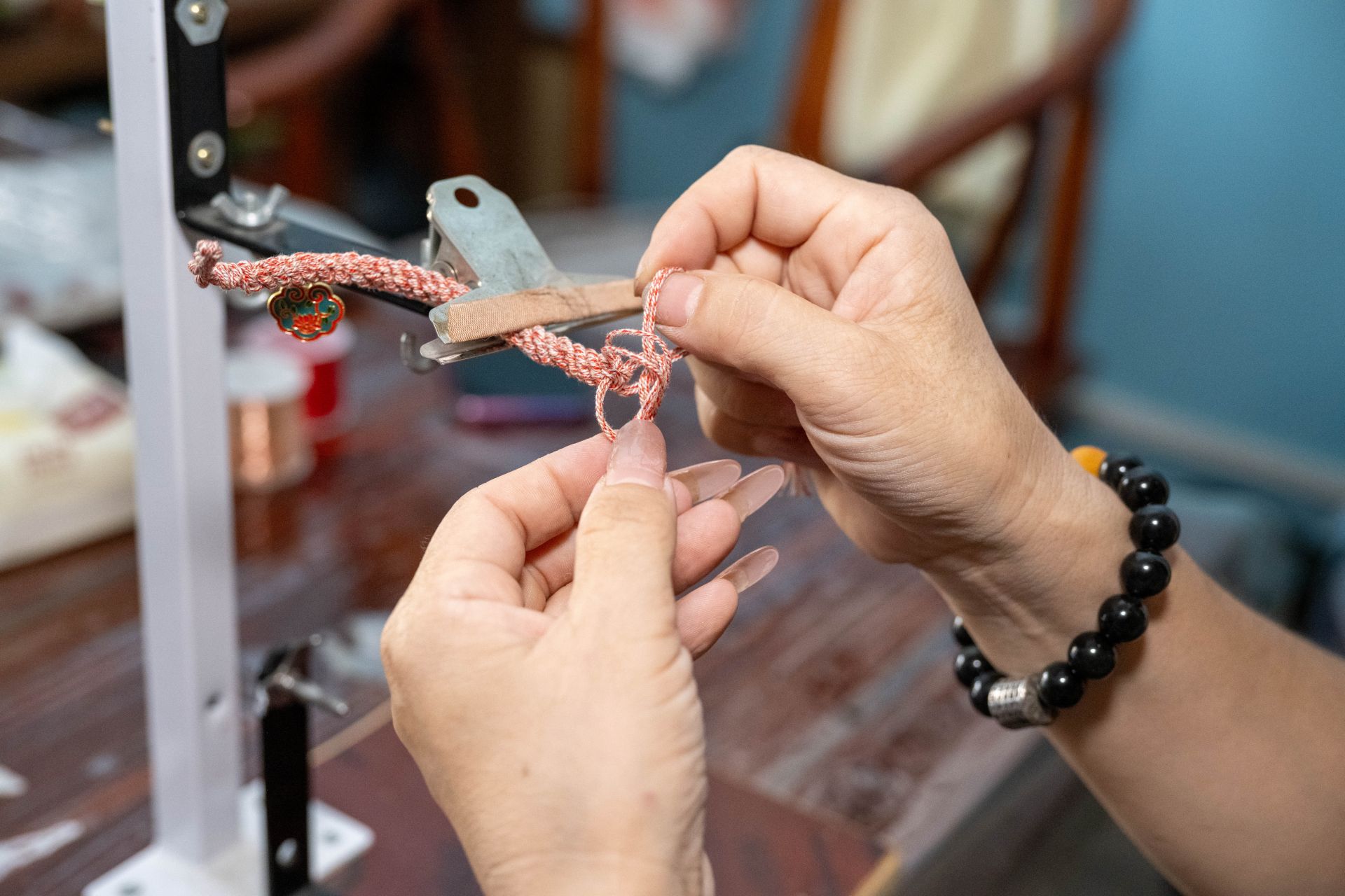 起初,季现慧靠着网上的教程自学编绳技法,遇到网上找不到的款式,她便悄悄跑到夜市小摊旁,一边假装逛街,一边仔细观察摊主的编织手法,默默记在心里,回到家后反复琢磨练习。编绳技艺自古有之,在唐宋时期便已发展为成熟的装饰艺术,每一种绳结都蕴含着独特的吉祥寓意。从简单的平结到复杂的蛇结,从基础的四股绳到精巧的八股绳,十几年来,季现慧沉浸在绳结的世界里,感受着绳结背后的文化底蕴。