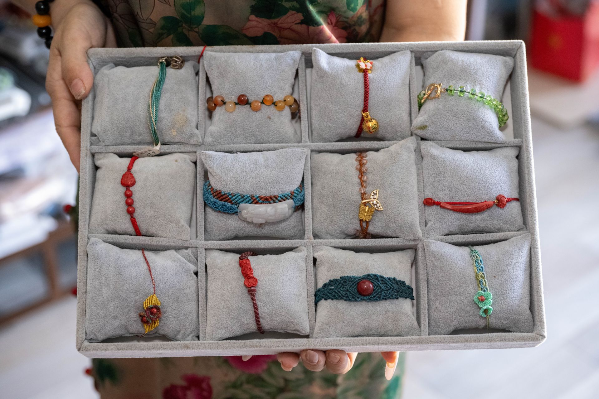 “编绳是个精细活,差一点都不行。”季现慧拿起一根比棉线粗不了多少的八股绳介绍道。这根由八根细绳盘结而成的绳子,表面纹路规整有序,笔直挺拔。她解释说,编绳过程中,每个结的张力都要拿捏得恰到好处,稍有过松或过紧,整条绳子就会歪歪扭扭,失去美感。这份对细节的极致追求,让她的技艺日渐精湛,也让她的作品渐渐有了名气,许多顾客慕名而来,不为珠宝玉石,只为搭配她编织的绳结。“本就漂亮的玉石,用精细的编绳点缀,质感更上一层楼。”顾客刘志抚摸着脖子上搭配编绳的平安扣,满脸赞叹。“本以为只是顺便学学,没想到学出了名堂。”季现慧笑着回忆,这份意外的收获,让她更加坚定了深耕编绳技艺的决心。