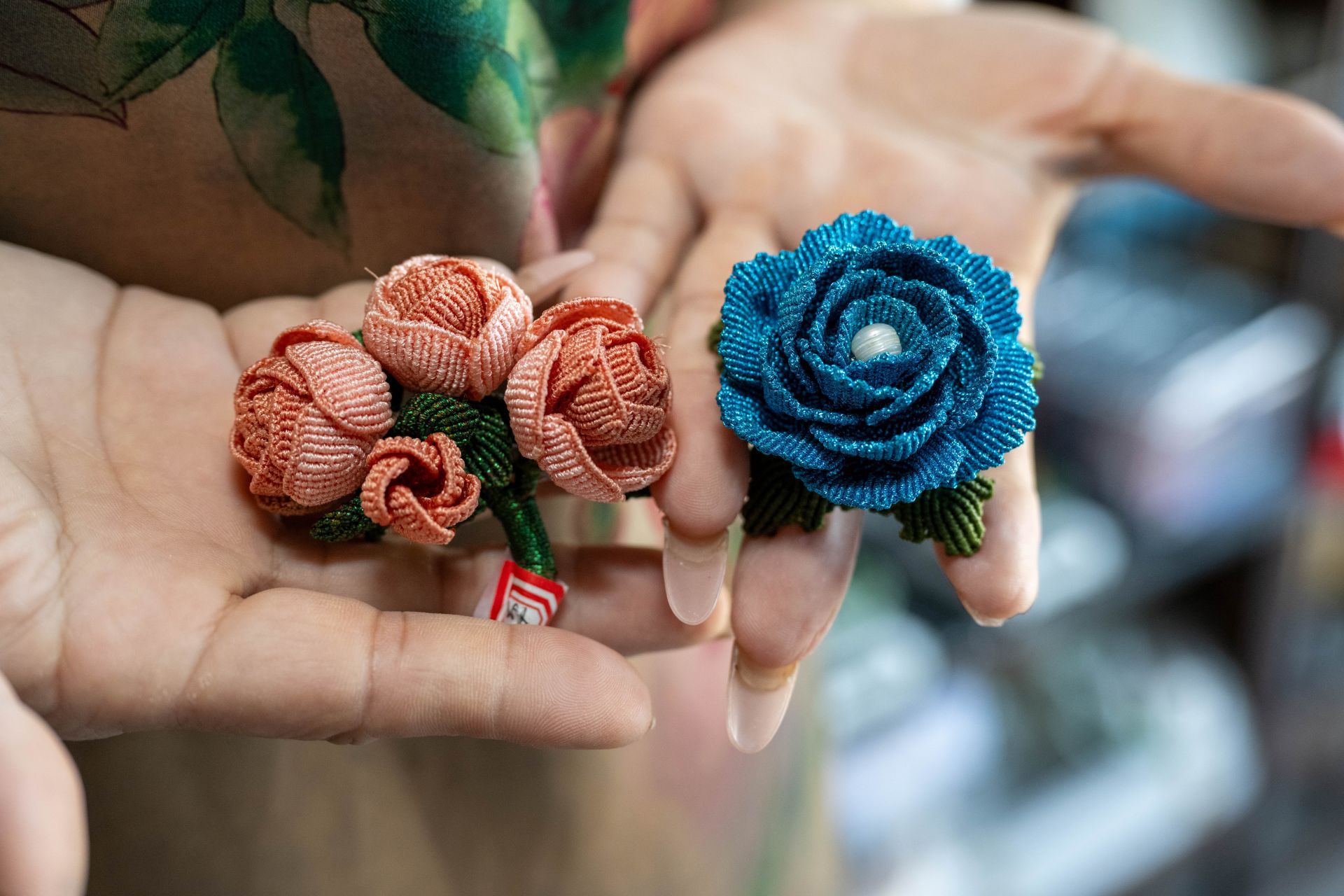 越来越多的人喜欢大型编绳作品,比如栩栩如生的十二生肖立体编绳,还有精致小巧的编绳胸针。季现慧拿出一枚玫瑰造型的编绳胸针,花瓣上布满密密麻麻的绳结,活灵活现,宛如真花。“这是一位顾客定做的,一枚能卖到一千多元。”她介绍道,这样的作品往往需要全职投入一周以上才能完成,耗费极大精力,因此产量不高,但每一件都是凝聚心血的精品。