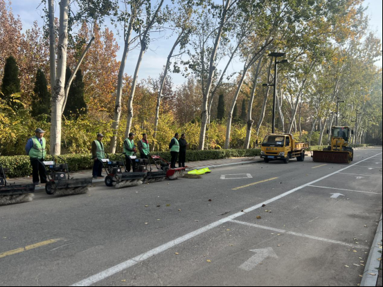 备足物资,夯实应急保障基础。严格遵循“备足、备优、备勤”原则,全面开展应急物资清查与备战,全力做到三个“确保”——对所有作业车辆及雪铲、滚轮等机械设备进行系统检修,确保性能稳定、状态良好;对融雪剂、推雪板、铁锹等清雪物资进行清点核查,及时补充,确保分类存放、管理有序;优化调用机制,明确存放位置与领用流程,确保应急状态下调拨迅速、高效便捷。