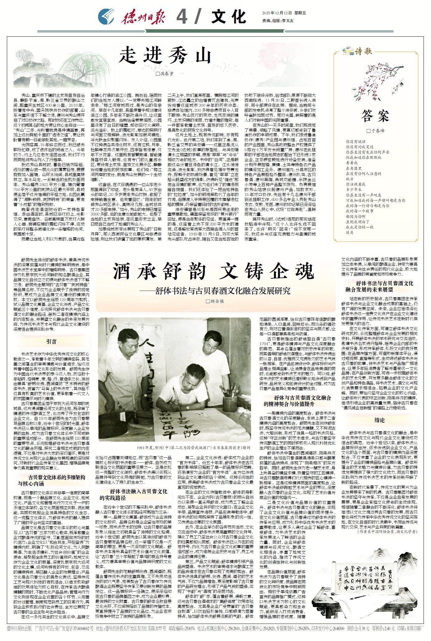 在文化传承方面,可建立舒体书法文化研究机构,系统整理舒体与企业发展的相关史料,开展舒体书法的学术研究与交流活动,邀请书法名家进行指导,培养企业内部的书法爱好者,形成传承舒体、弘扬文化的良好氛围;在品牌传播方面,可借助新媒体平台,通过短视频、直播等形式,生动讲述舒体书法与古贝春的故事,将书法艺术与产品推广相结合,让更多年轻消费者了解并喜爱这一文化品牌;在产品创新方面,可进一步挖掘舒体书法的艺术元素,开发更多融合舒体文化的文创产品和特色酒品,将书法艺术、酒文化与现代消费需求相结合,拓展企业的文化产业链。同时,要始终坚守企业文化的核心内涵,让舒体所代表的守正创新、刚柔并济的精神,继续引领企业的高质量发展,陪伴古贝春在“儒风润业启新程”的道路上行稳致远。