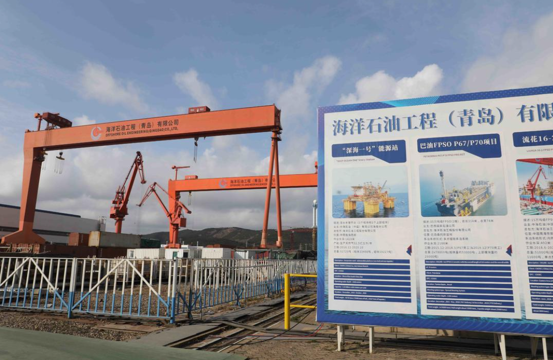 海洋石油工程(青岛)有限公司市场经营部客户经理刘帆介绍,青岛公司经过三期建设,总占地面积约120万平方米,年加工能力30万吊重吨,年均约有1.2万人长期稳定在场地施工作业,是目前世界最大的海洋工程制造场地之一。