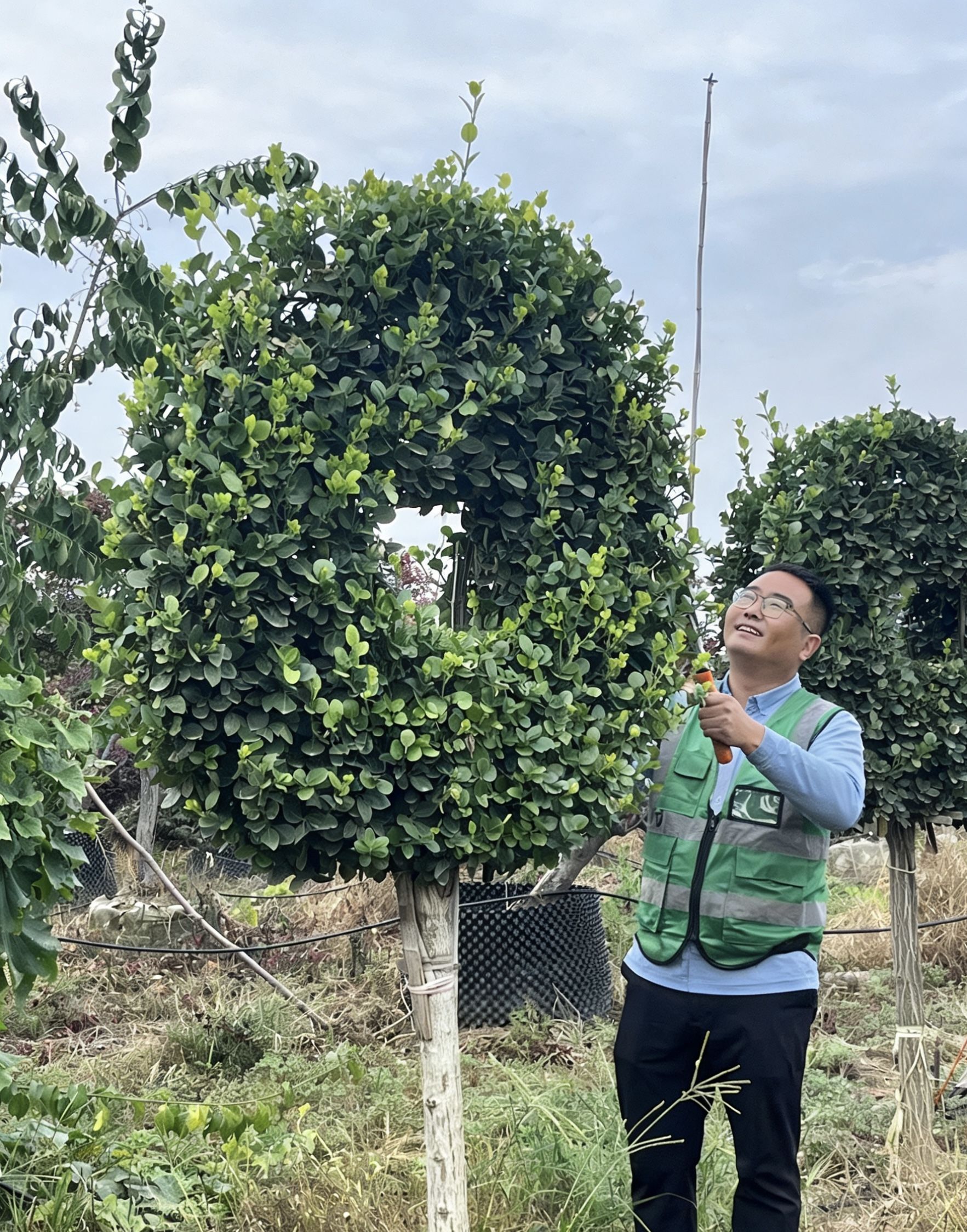 12月3日,走进张振南的树艺农场,只见一个身影正手持园艺剪,在林间穿梭。伴随着清脆的“咔嚓”声,多余的枝条簌簌落下,不过半小时,原本略显杂乱的树冠,渐渐显露出圆润饱满的“爱心”轮廓。
