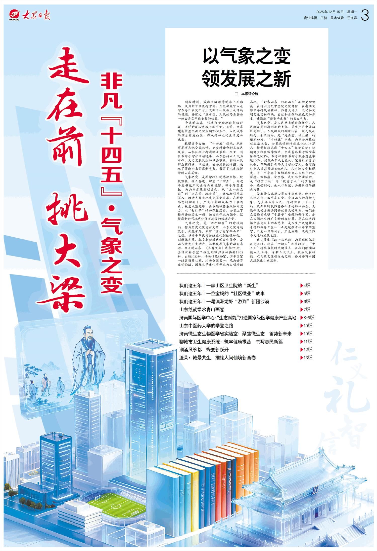 气象之变,是科学指引的落地生根。殷殷嘱托,催人奋进。回望“十四五”,习近平总书记三次亲临山东视察,寄予厚望重托,为山东发展指明方向。从“三个走在前”到“走在前、挑大梁”,战略指引层层深入,推动齐鲁大地发生深刻变革。在科学思想的指引下,广大干部群众奋力干事创业、锐意攻坚克难,在各领域各条线协同发力,以“钉钉子”精神狠抓落实,全省上下精神面貌为之一新,担当实干成为强音,汇聚成新时代现代化强省建设的磅礴力量。