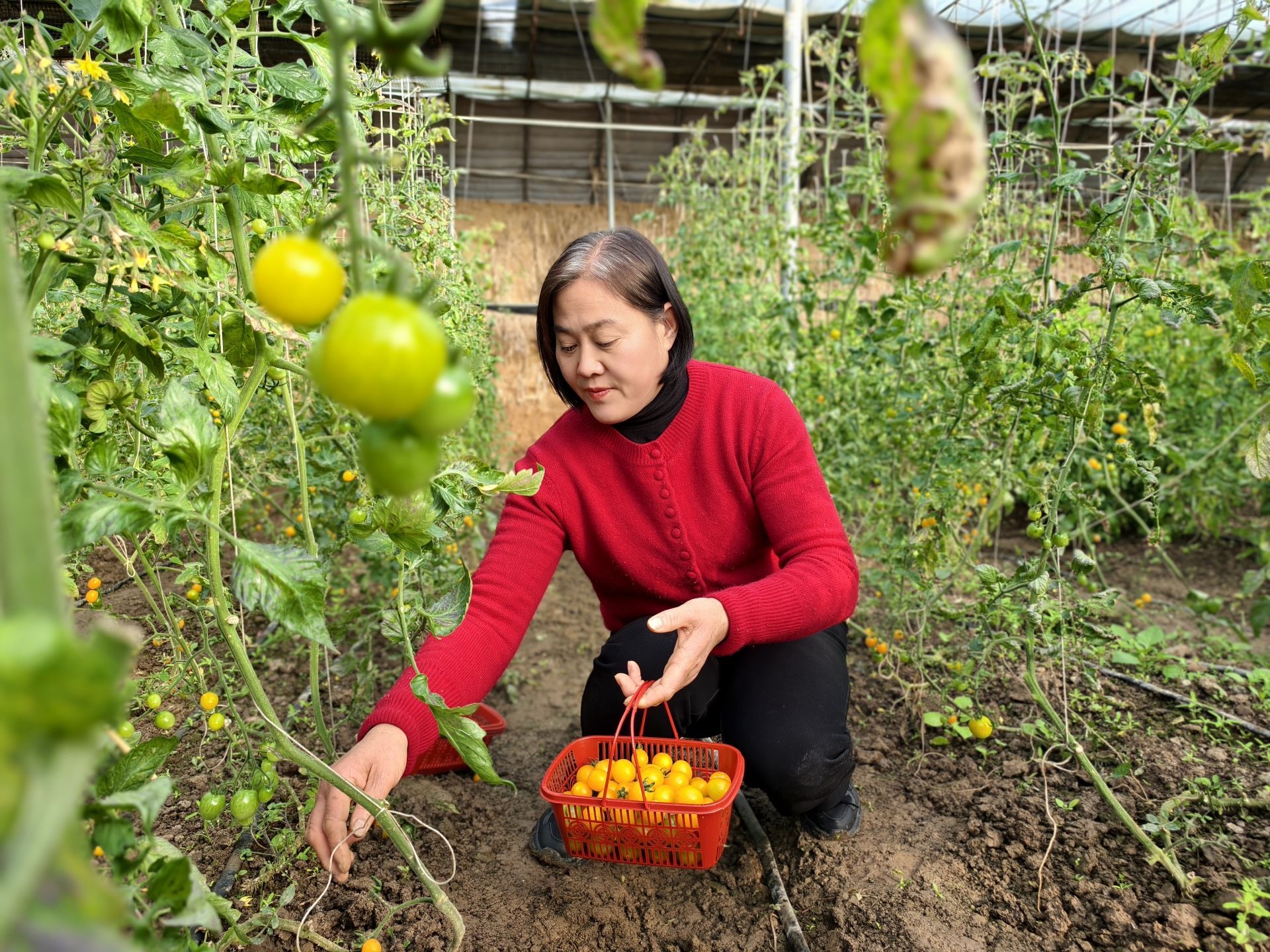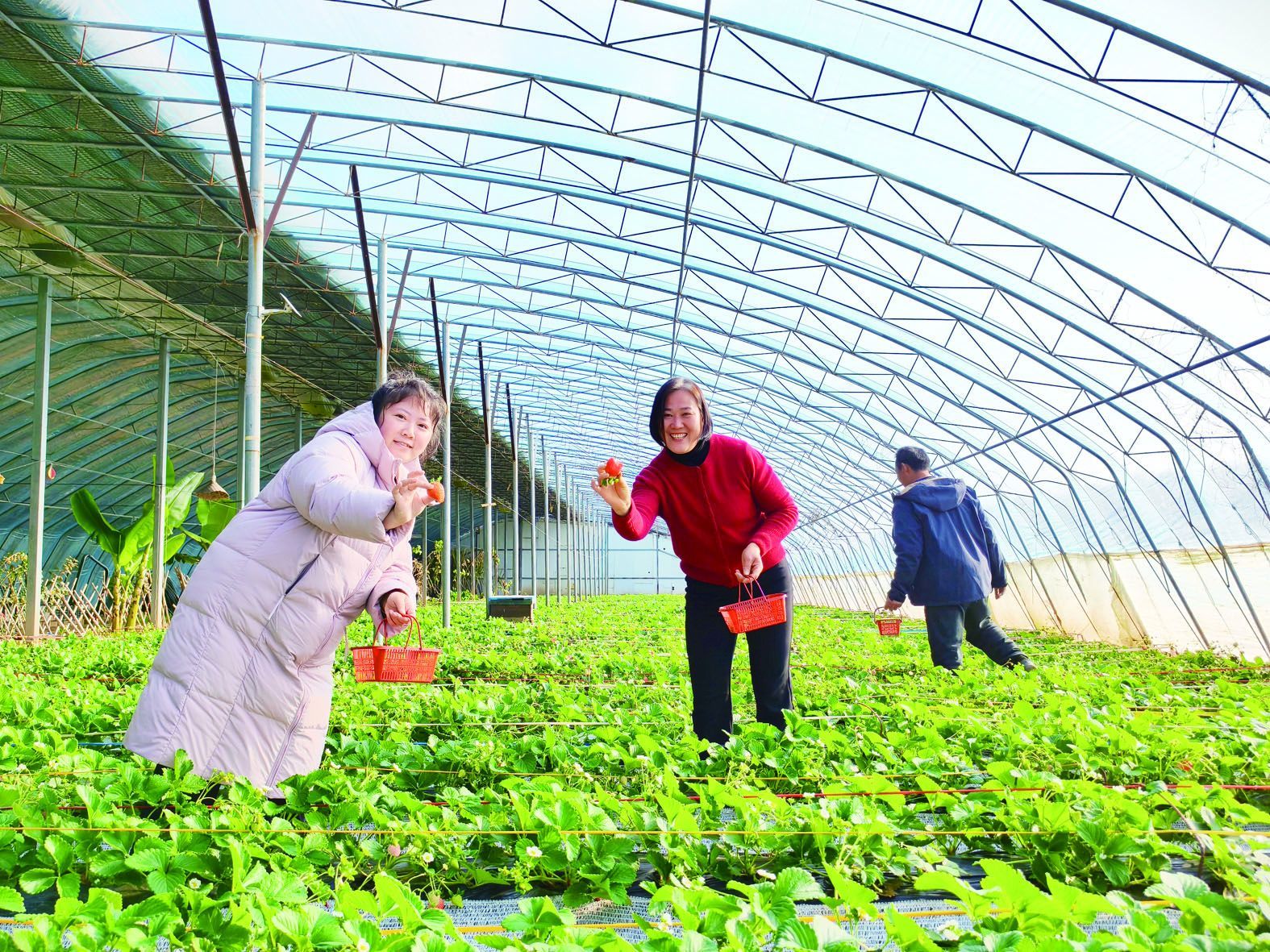 12月11日上午,冬日暖阳洒在丁坞镇小孟村有机农业示范基地的大棚上,大棚内,红彤彤的西红柿挂满枝头,47岁的农场主王春华穿梭其间,小心翼翼地采摘成熟果实,丈夫杨清兵则在一旁准备直播带货。夫妻俩原本在天津创办了一家全屋定制装修公司,经营了20余年,但为了回村照顾年迈的老人,2018年,他们主动放弃大城市的优渥生活,返回家乡,投入超百万元,种植有机草莓和西红柿,养殖兔子等小动物,走出了一条“生态种植+特色采摘”的农旅融合之路。