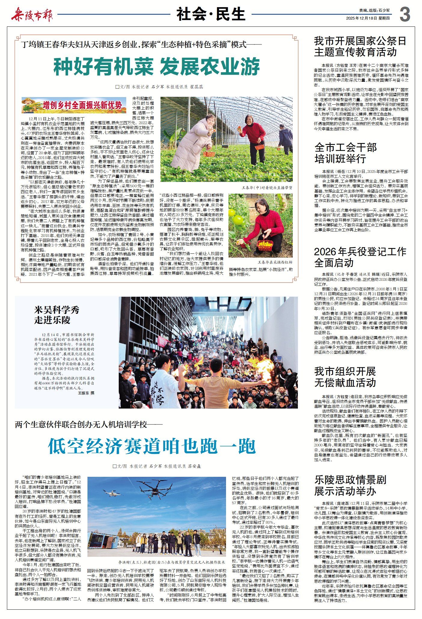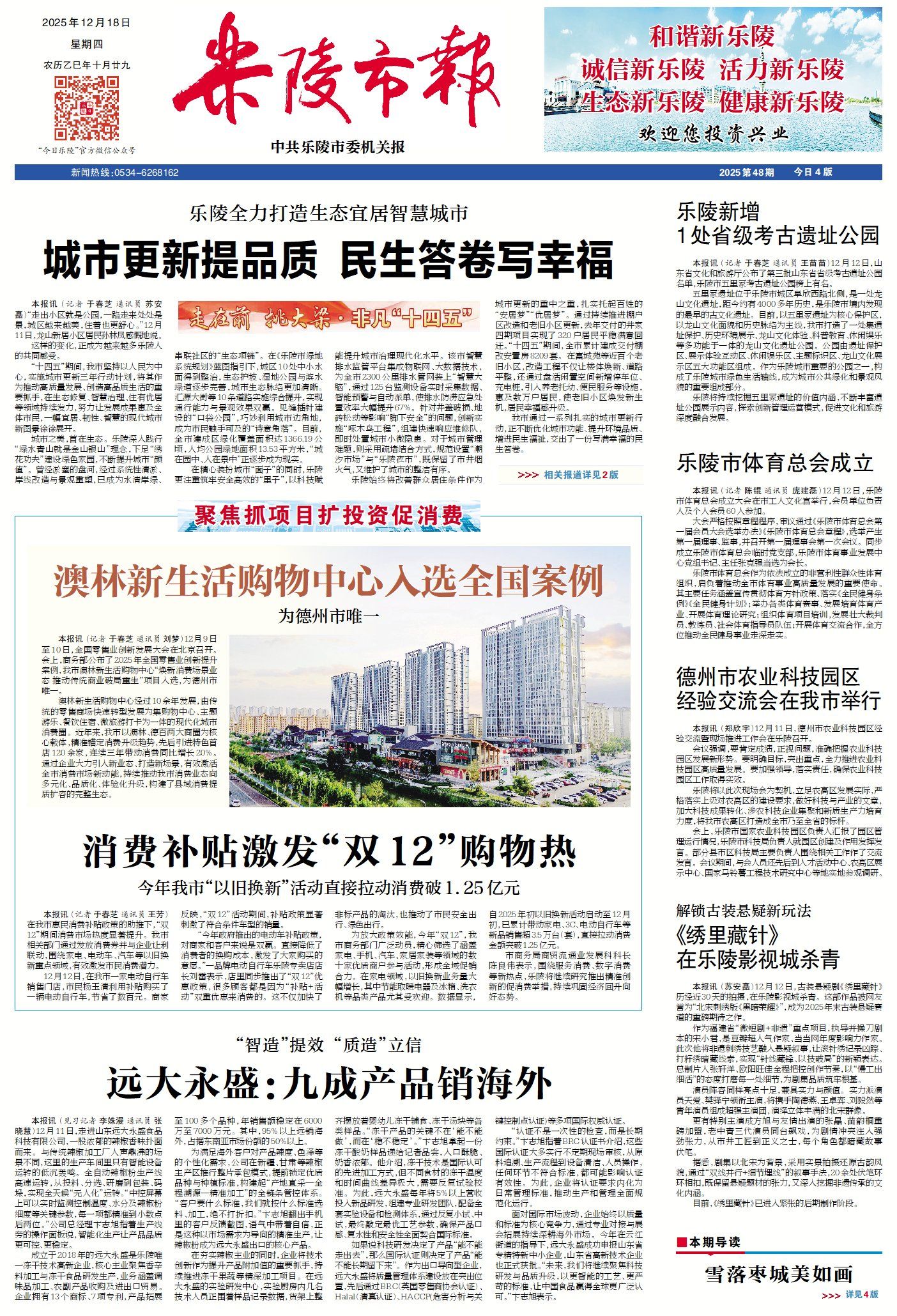 乐陵市新闻周报(12月12日至12月18日) ©原创 2025-12-18 07:39 0 ▶乐陵:消费补贴激发“双12”购物热(点击查看详情) ▶乐陵远大永盛:高品质产品逾九成销海外(点击查看详情) ▶乐陵:城市更新绘就宜居新画卷(点击查看详情) ▶乐陵丁坞镇王春华夫妇返乡创业,种的有机草莓西红柿真的很好吃(点击查看详情) ▶乐陵俩生意伙伴联合创办无人机培训学校,闯闯低空经济新赛道(点击查看详情) ▶乐陵:雪落枣城美如画(点击查看详情) 德州日报新媒体出品编辑|于春芝审核|胥爱珍 终审|尹滨