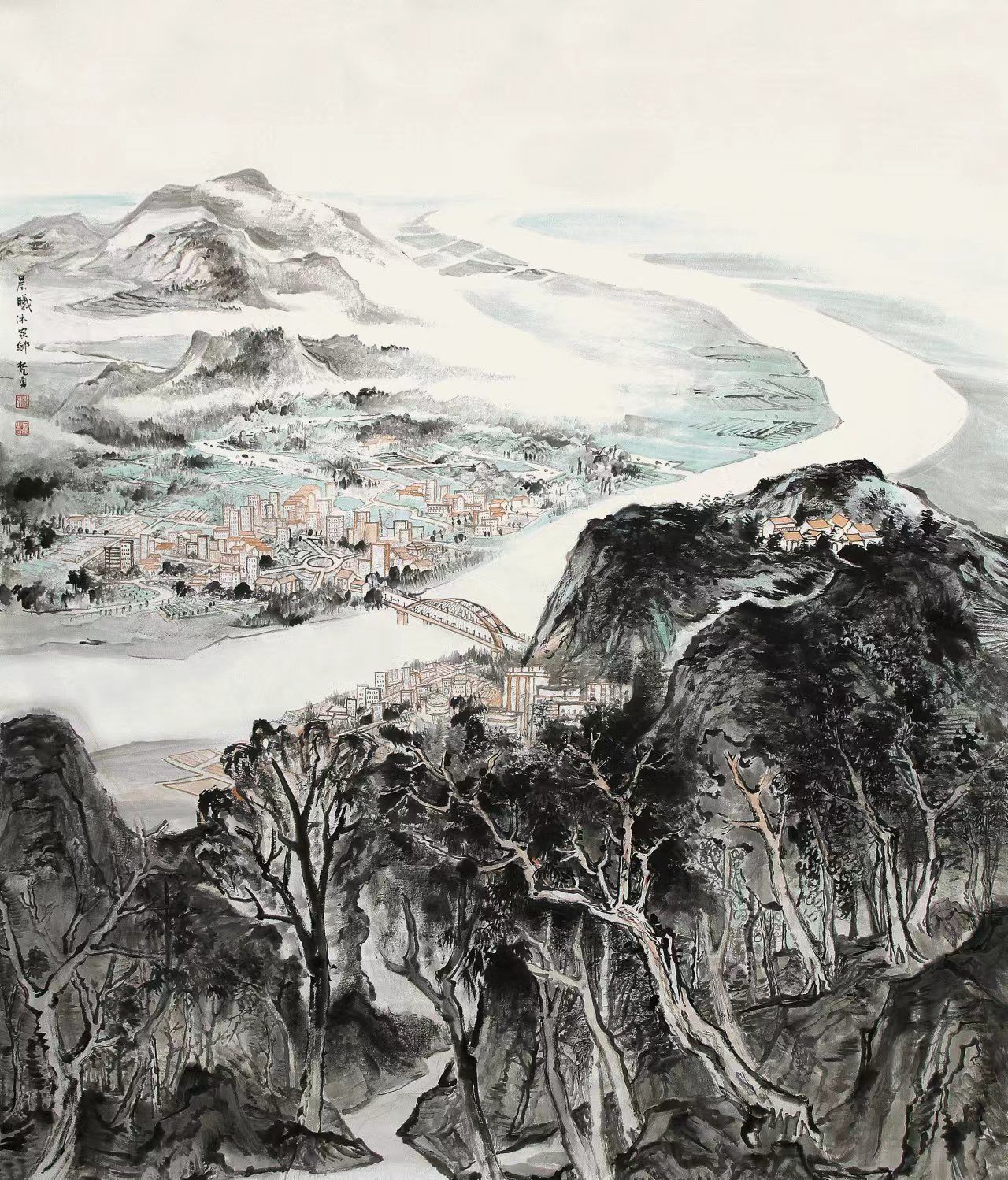 作为土生土长的齐河人,杜凡勇始终怀着对家乡的深厚感情,他的画笔,也越来越多地聚焦于家乡。“中国画以写意为主,重在传神达意,而非照搬现实。齐河虽无山,但我们可以在心中造山,将家乡的平原风光与山水意境相结合,创作出具有齐河特色的山水画。”杜凡勇说。他创作的《晨曦沐家乡》《黄河岸边是家乡》等画作,以写意的笔法,将齐河的城市风貌、田园风光融入山峦环绕的意境中,山与城相映成趣,古与今完美交融,笔墨间饱含着对家乡的热爱与赞美。