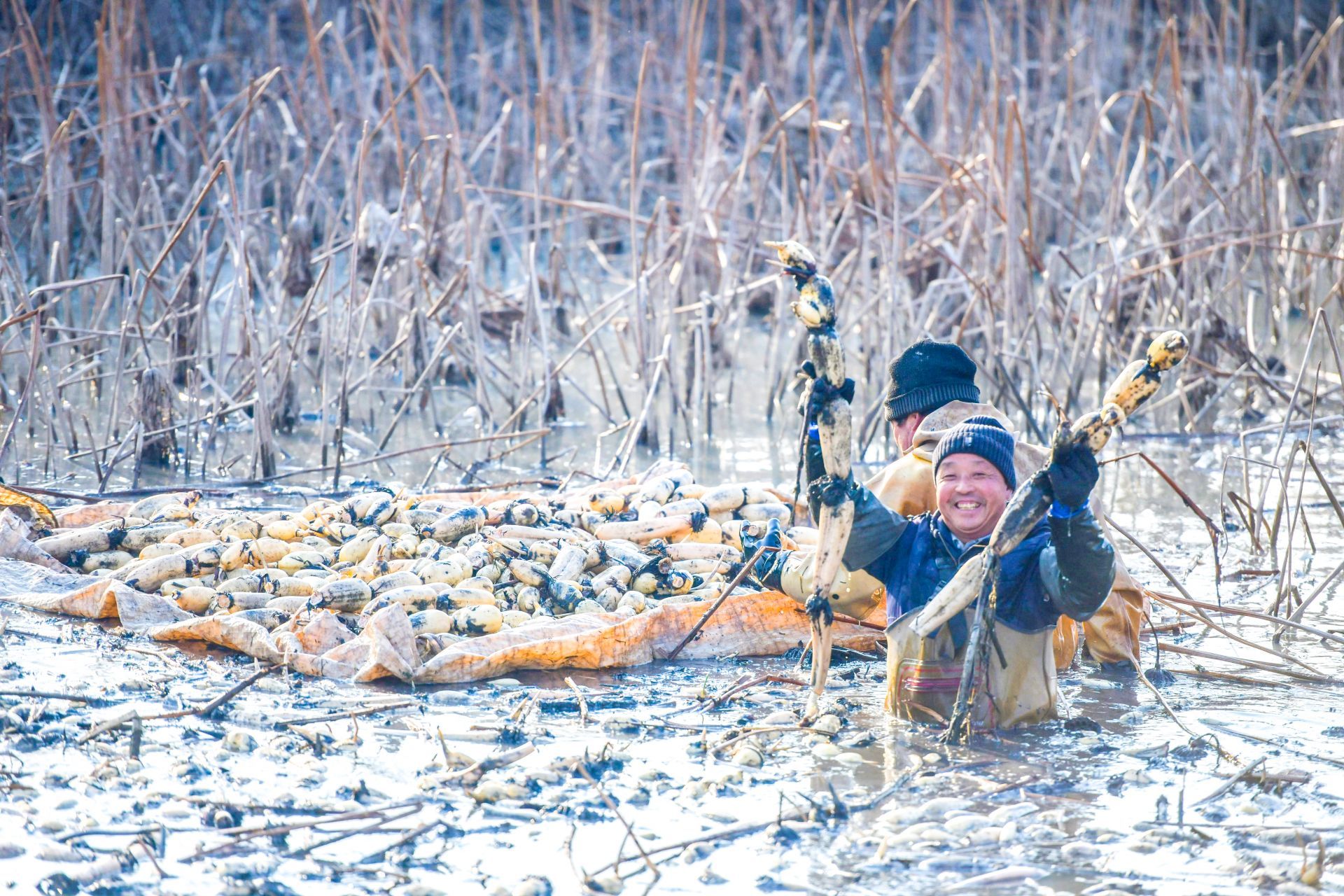 眼下正值采藕旺季,基地不仅富了村民的“钱袋子”,更带来家门口的就业机会。每年9月至次年5月,这里日均用工30余人。“按小时算钱,一个月能拿两千多块钱。”村民李强一边麻利地装袋,一边笑着说,“在家门口干活,挣钱顾家两不误,比外出打工踏实多了。”