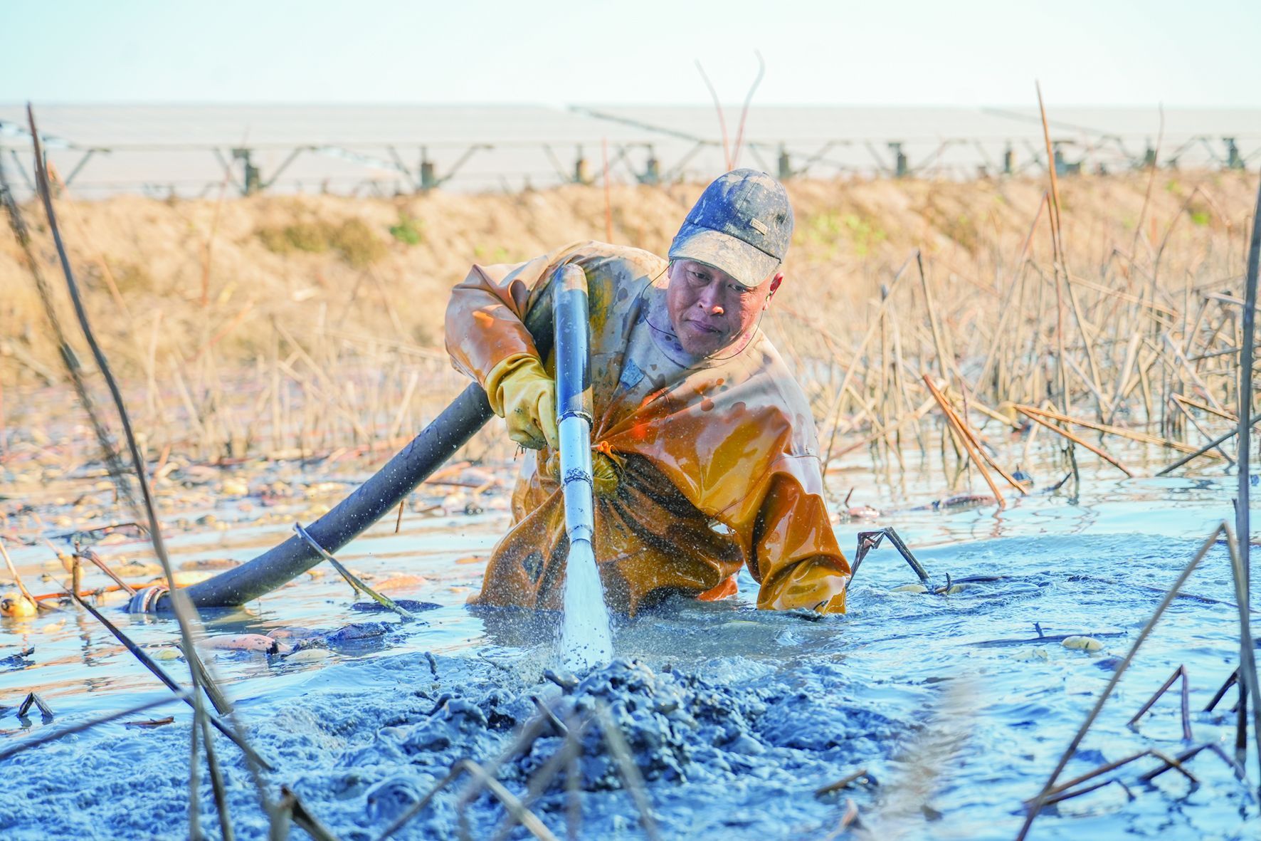 12月11日早上8点,位于禹城房寺镇的齐鲁林凯合作社莲藕基地早已忙碌起来。挖藕工们身着防水服,手持高压水枪,俯身在泥水中探找。只见强劲水柱冲开淤泥,一根根白皙饱满的莲藕便顺势浮出水面。分拣、冲洗、装袋……一道道工序有条不紊,新鲜莲藕即将装车发往全国各地。