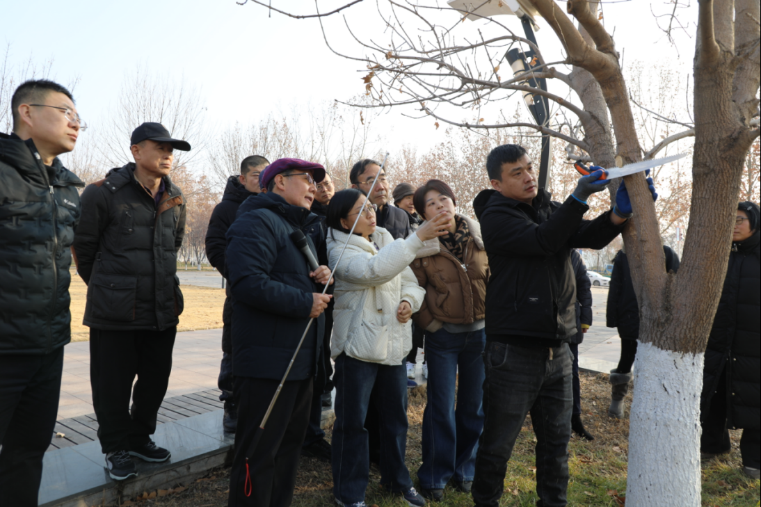 问诊把脉,实地调研精准破题。李存华教授深入养护一线开展实地调研,针对国槐长势衰弱等问题,现场开出“药方”,提出科学可行的国槐复壮措施;围绕白蜡、丛生紫薇、木槿、暴马丁香等乔灌木的修剪现状,逐一进行点评指导,提出针对性优化建议,为在场专业技术人员带来全新启发。