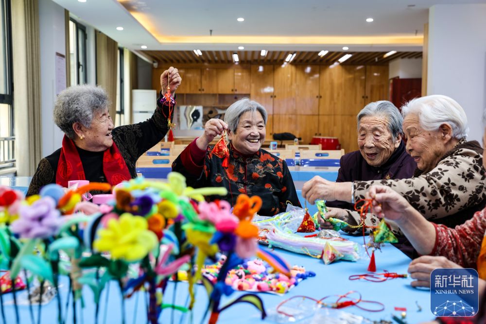 12月19日,在山东省乐陵市德乐怡嘉长者公寓,老人们在制作福袋包。新华社发(贾鹏摄)