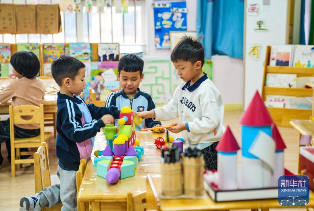 12月19日,在山东省乐陵市天和嘉园幼儿园,小朋友在进行建模游戏。新华社发(贾鹏摄)