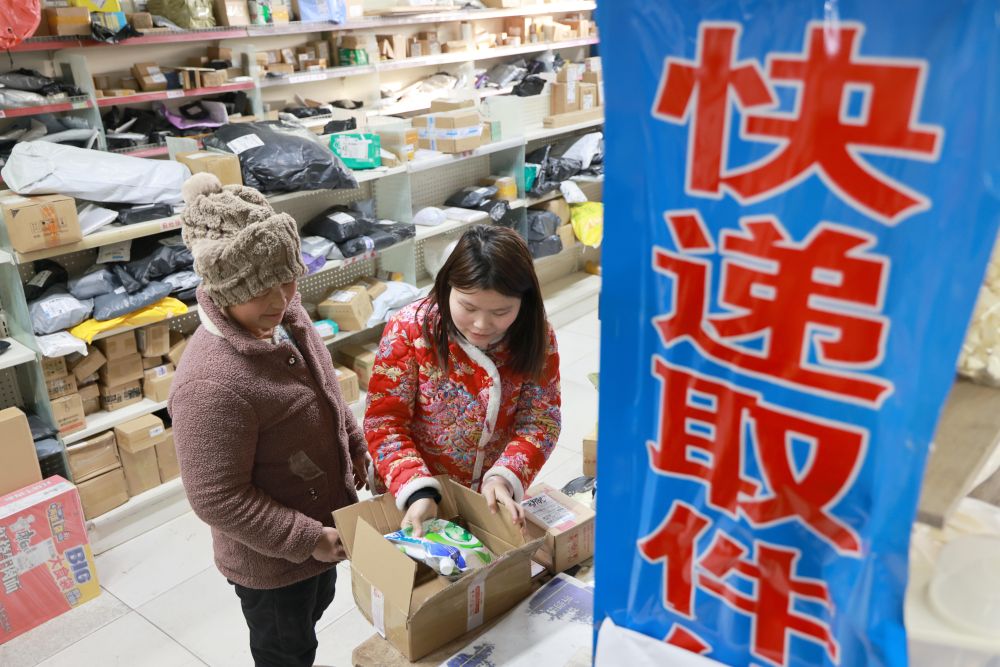 12月18日,在山东省乐陵市西段茂盛超市快递服务网点,工作人员帮助村民取快递。新华社发(许传宝摄)