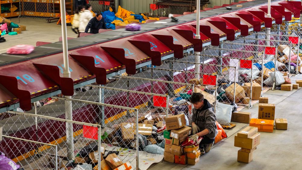 12月18日,在山东省乐陵市客货邮快递物流共配中心,工作人员在智能分拣作业线上忙碌(无人机照片)。新华社发(贾鹏摄)
