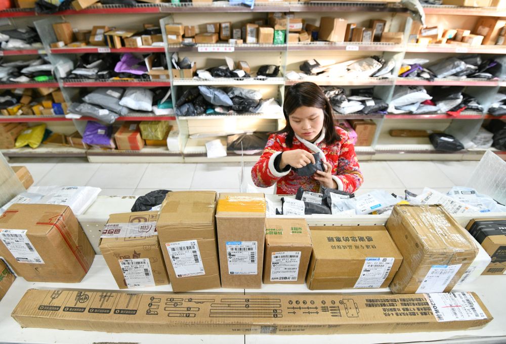 12月18日,在山东省乐陵市西段茂盛超市快递服务网点,工作人员在分拣快递件。新华社发(刘振兴摄)