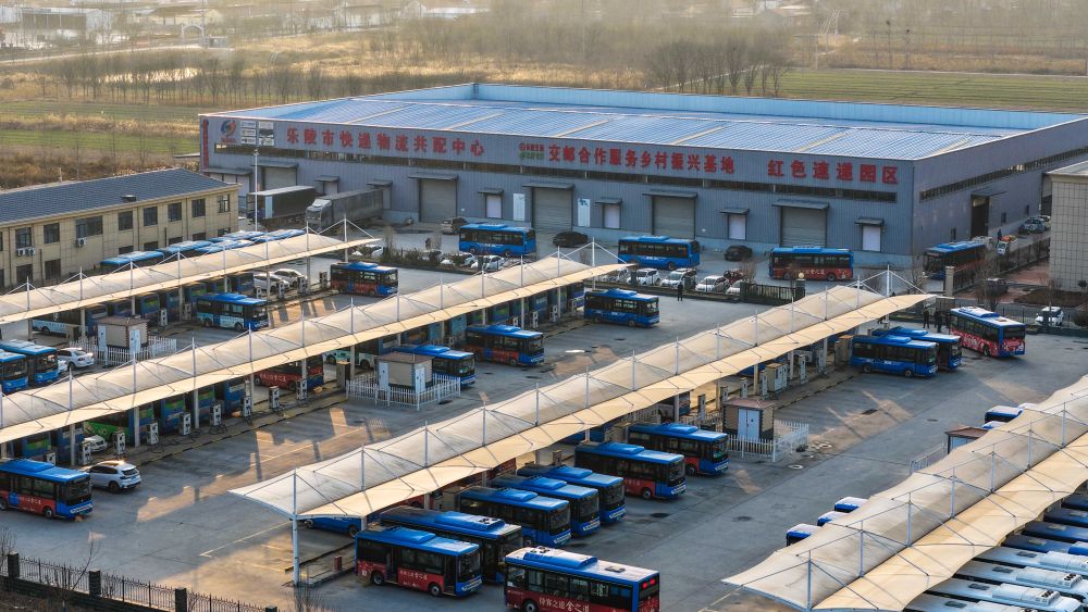 12月18日,装载着快递邮件的公交车从山东省乐陵市交邮合作服务乡村振兴基地驶出。新华社发(贾鹏摄)
