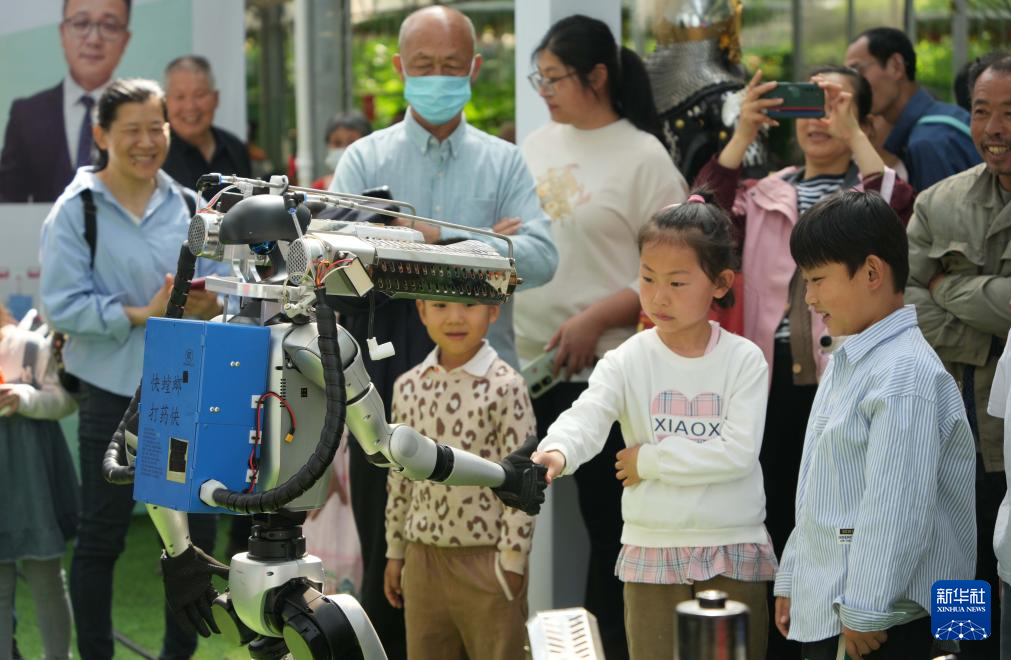 4月20日,在第二十六届中国(寿光)国际蔬菜科技博览会上,人们在观看农业机器人展示。新华社记者 徐速绘 摄